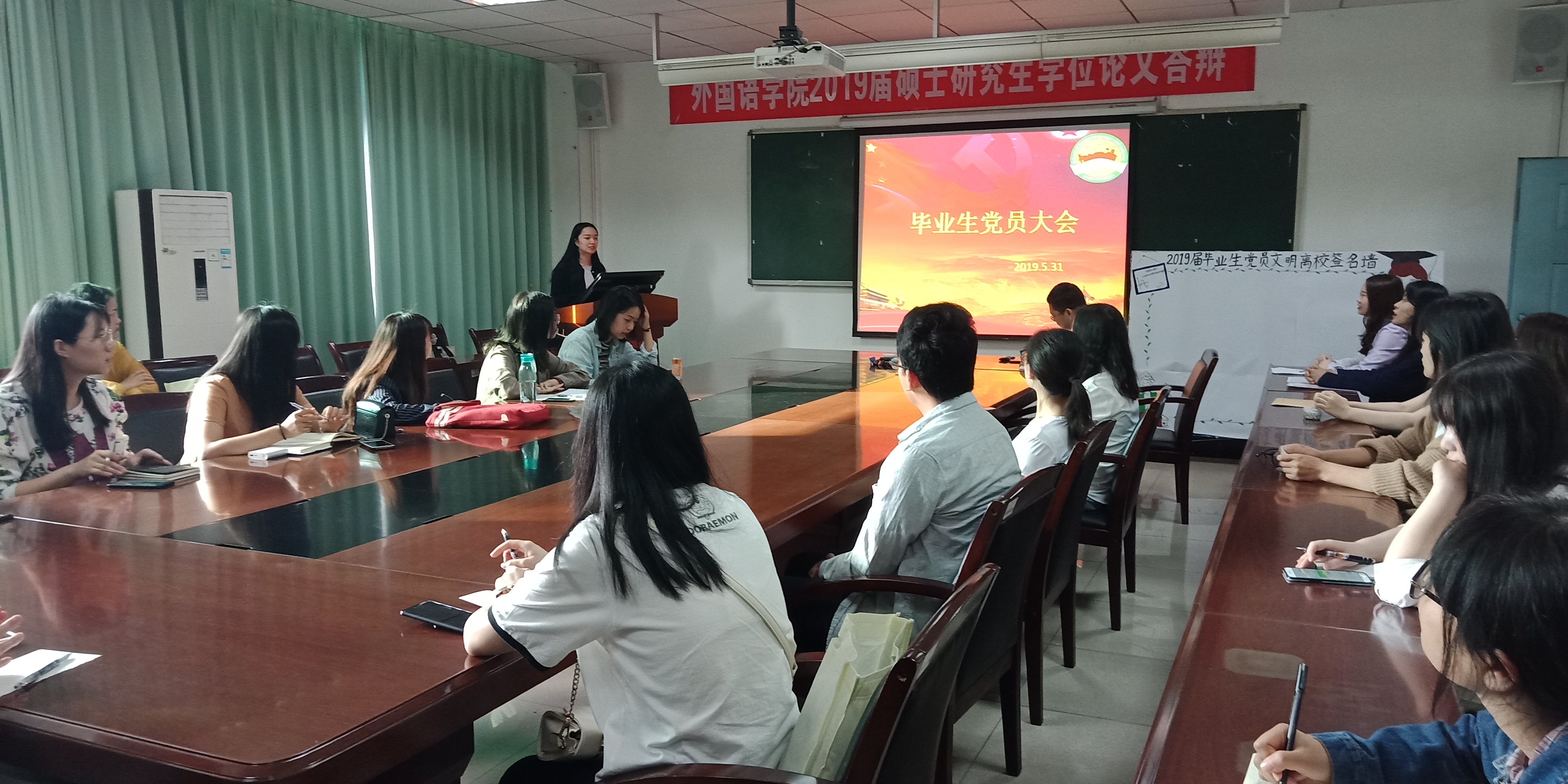 首先,主持人对到场老师及同学表示欢迎,并让同学们重温入党誓词,回顾了自己的入党以来的心路历程。紧接着,毕业研究生党员余璐对此次大会主题进行了详细解说,对于党组织关系接转的程序进行阐述。随后,2015级本科学生支部书记卿香君宣读了致毕业生党员的一封信,并对于毕业党员生的权利与义务展开叙述,号召毕业生党员们在文明离校时站好最后一班岗。大会最后,2019届全体毕业生党员进行文明离校签名活动。