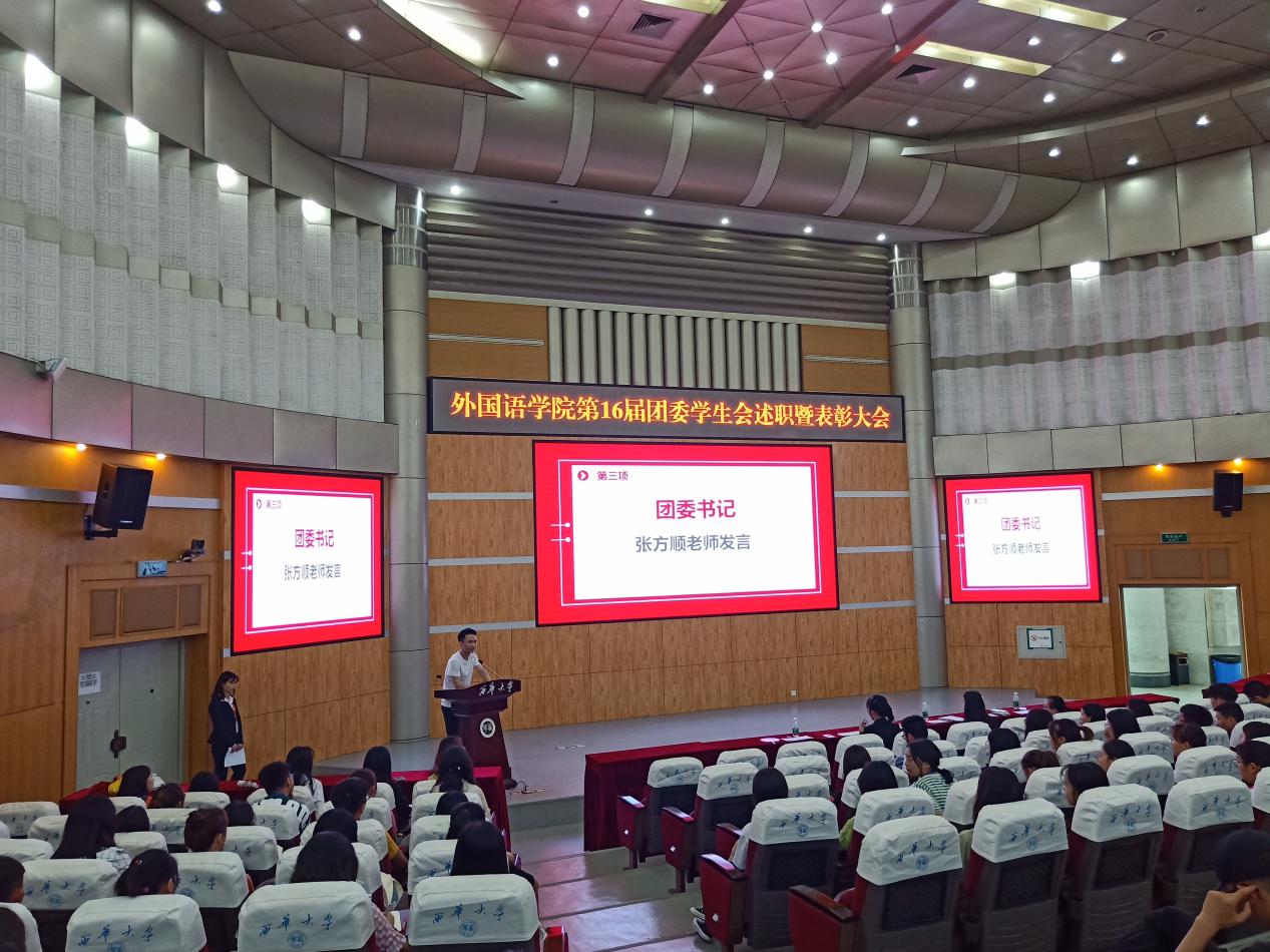 大会以全体成员齐唱共青团团歌的形式拉开序幕。首先,张方顺老师发言,他对学生会全体成员这一年来积极支持团学工作表示衷心的感谢,在肯定学生会工作方面优点的同时也对工作中存在的不足提出建议。他还提出,加入学生会应该收获友谊,使各方面能力得到锻炼和提升,让加入学生组织变得有意义,以一颗积极健康向上的心态努力学习,让自己变得更加优秀。
