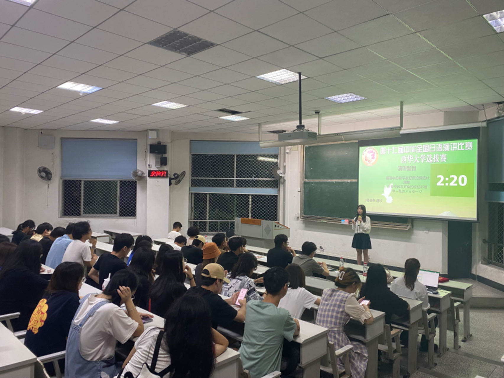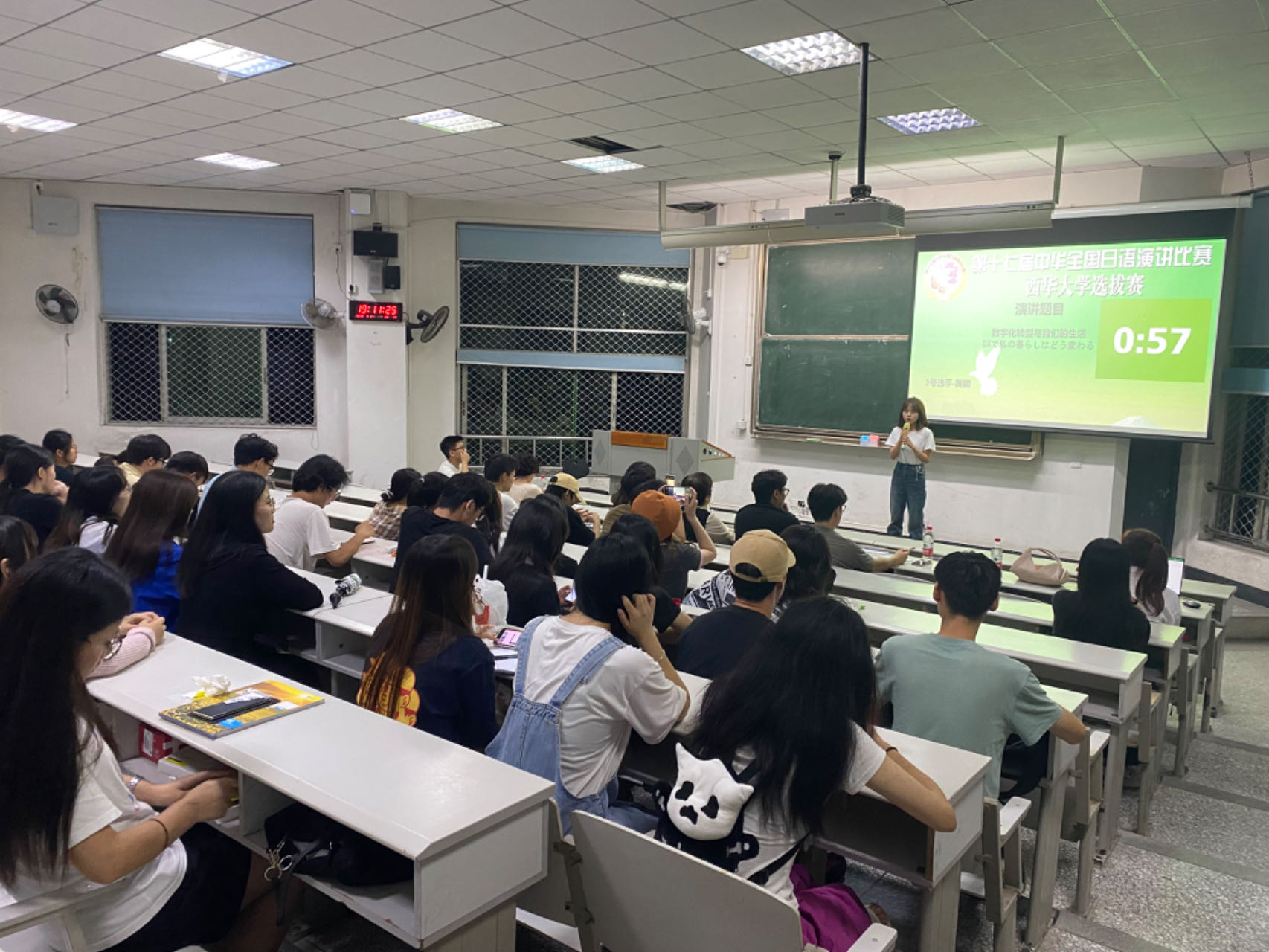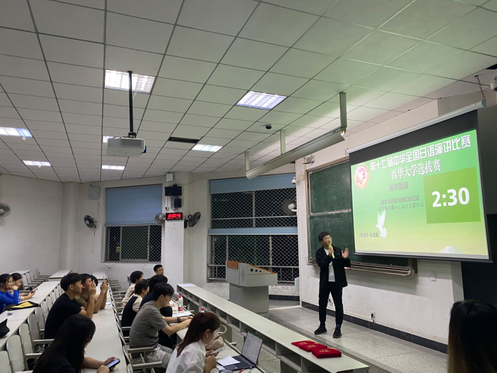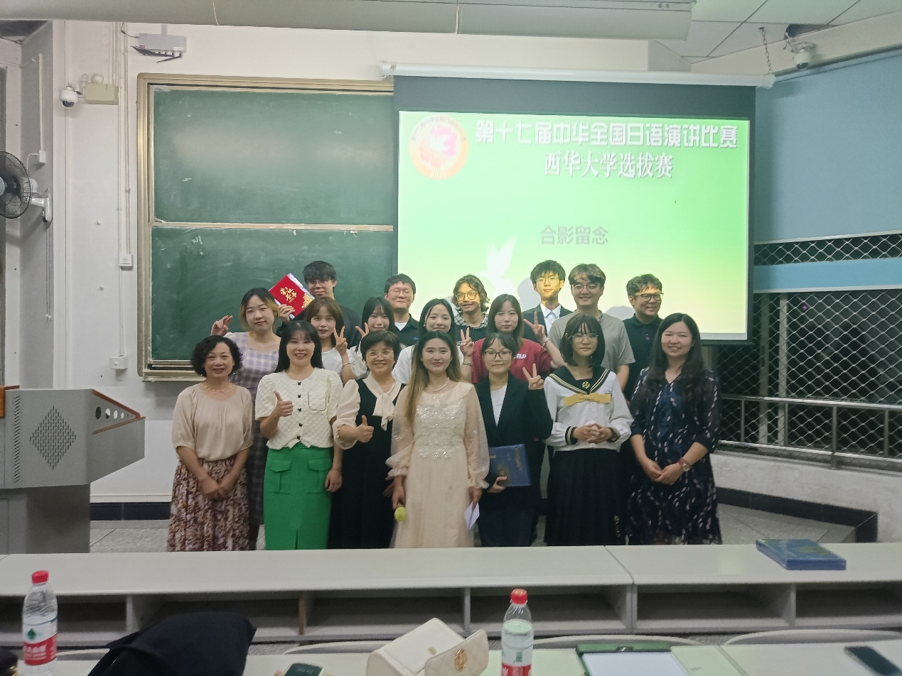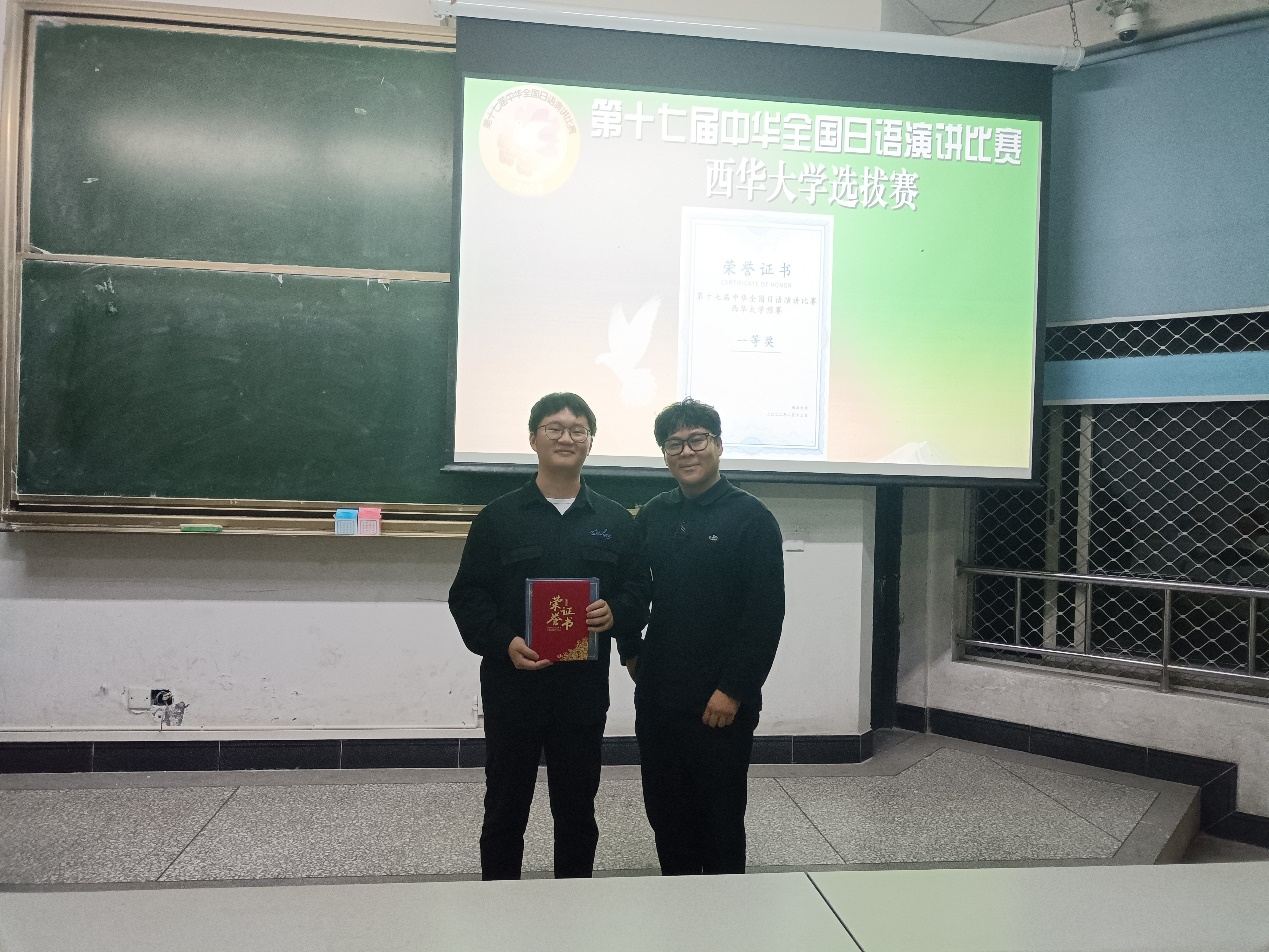 本次比赛在第四教学楼举行,日语系森永老师、黄倩雯老师、刘玉茹老师、朱大江老师、杨清老师、尹建英老师担任本次比赛评委,共有11名同学参赛。在本次选拔赛中牟成鑫同学发挥出色,获得了一等奖,将于11月19日代表我校前往西南大学参加西南地区预赛。此外,赖玉珠同学和张一帆同学在选拔赛中获得了二等奖,黄颖同学,吴星宇同学和王洋同学在选拔赛中获得了三等奖。