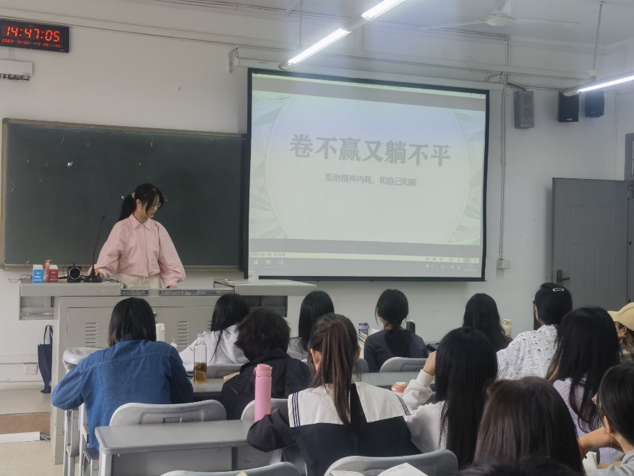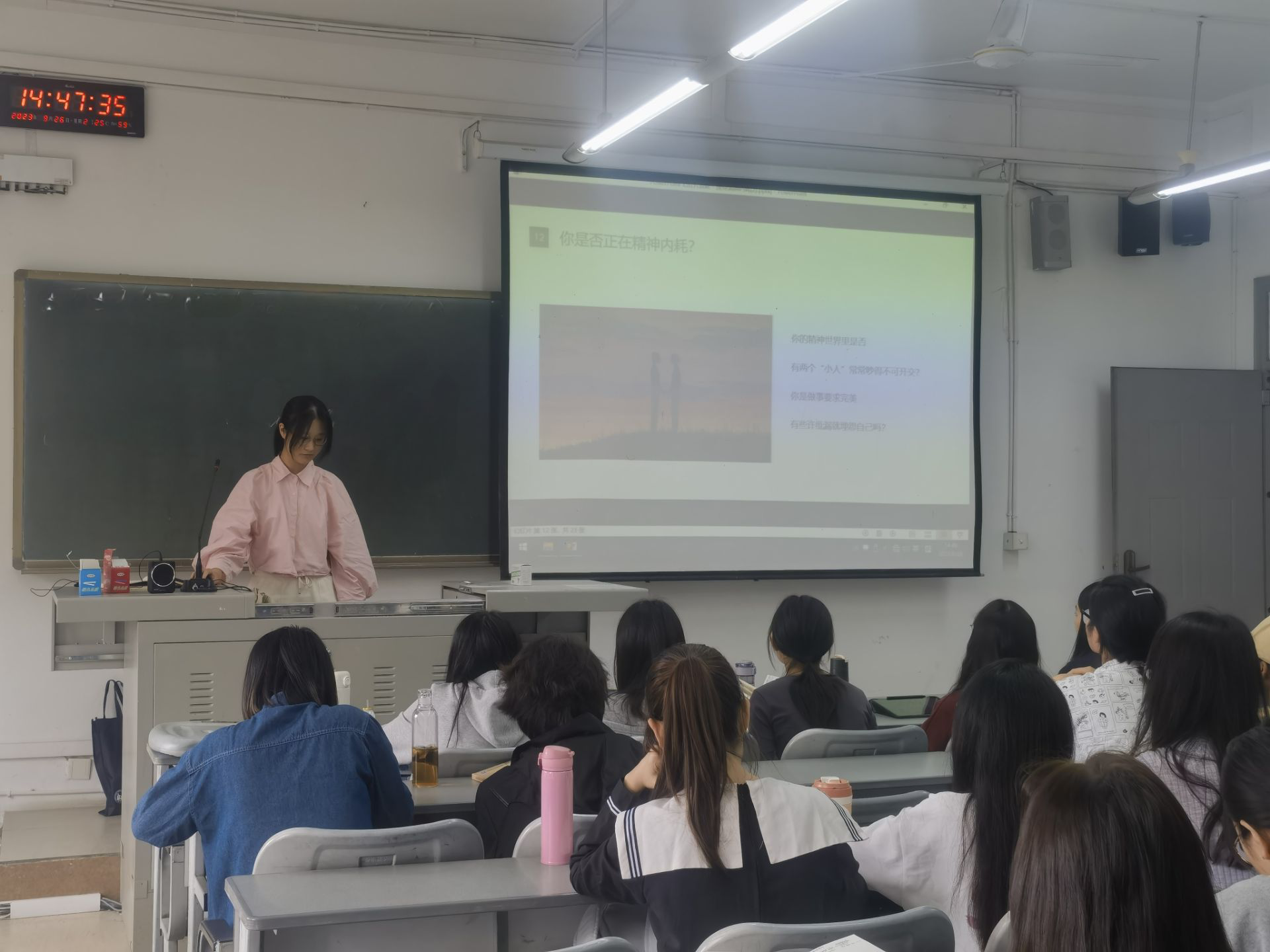 此次活动首先从“什么是精神内耗”、“你是否在精神内耗”、“精神内耗的影响”以及“如何摆脱精神内耗”四个方面,利用PPT阐述了精神内耗的相关内容,引发了同学们的广泛思考。也有同学提出了深刻的见解,例如:精神内耗本质上其实是不甘心,是希望努力奋进的一个信号。只要合理、适当的控制和利用,也可以成为促进我们更进一步的基石。