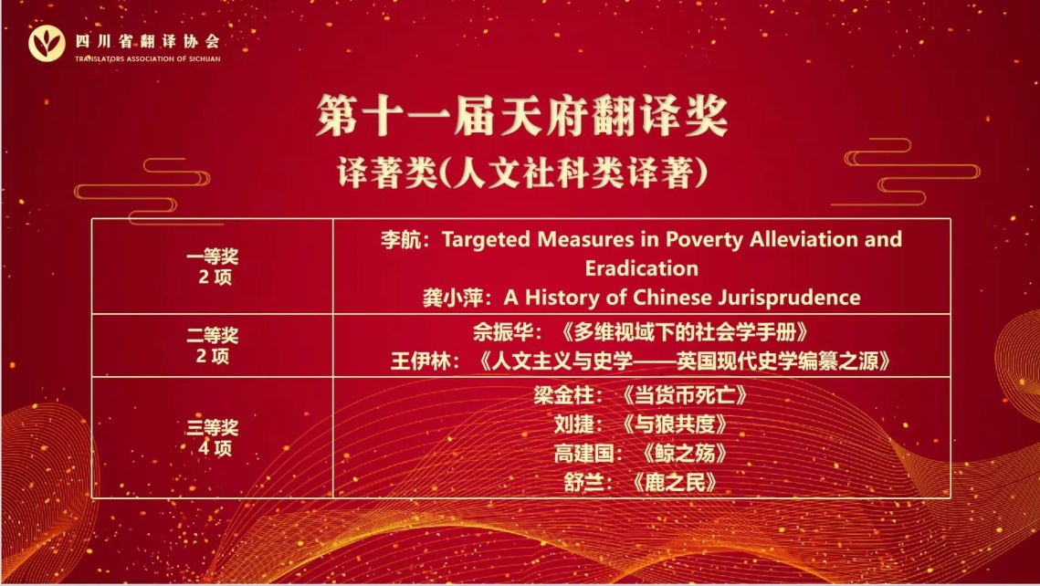在本次年会上,我院龚小萍教授和于云飞博士的译著《A History of Chinese Jurisprudence》荣获第十一届“天府翻译奖”译著类(人文社科类译著)一等奖。“天府翻译奖”是目前四川省翻译学界规格最高的奖励,我院学者获此殊荣,体现了四川翻译学术共同体对伟德国际1949,伟德国际1949始于英国翻译实践能力的极大鼓励与高度认可。