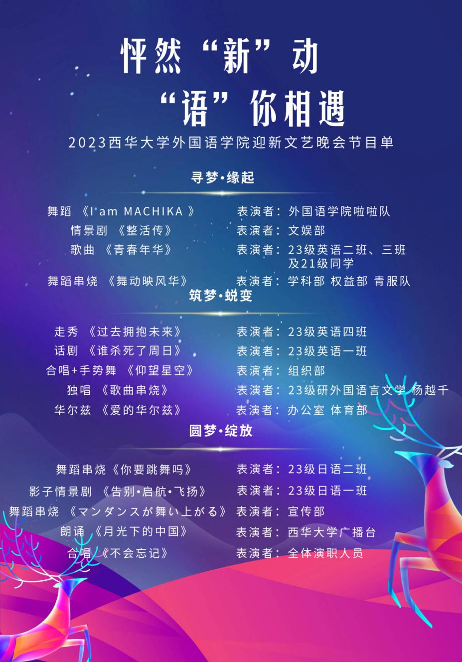 欢乐的时光总是很短暂,晚会在观众们的喝彩声、欢呼声中圆满落幕。今夜,青春尽情的绽放,梦想自由的飞翔。本场晚会演绎了一曲精彩绝伦的青春之歌,进一步激发了同学们的青春活力,充分展现了外院学子昂扬向上的精神风貌,为2023级同学们的大学篇章画下了浓墨重彩的一笔。在这里,祝愿2023级的同学们度过绚丽多彩的大学生活!