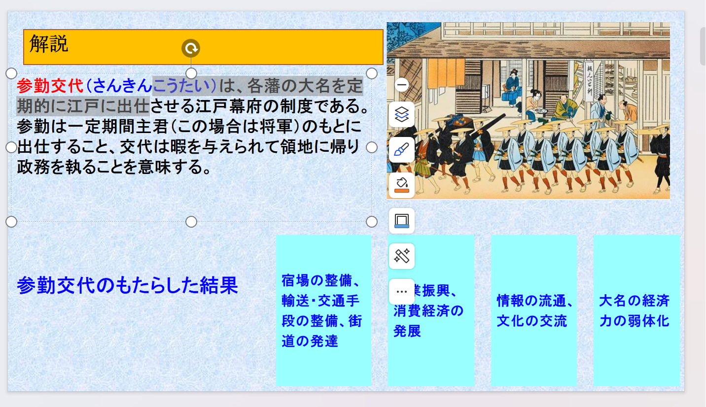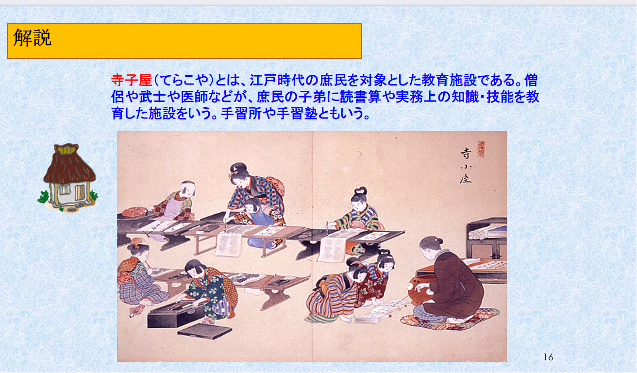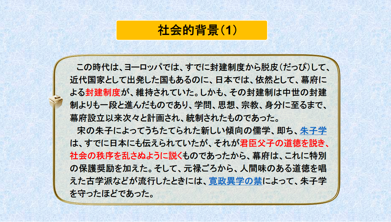 在讲解中主要对日本近世文学的文学概况进行了介绍。例如:当时的(1)寺請(てらうけ)制度、(2)身分統制、(3)参勤交代制度等。