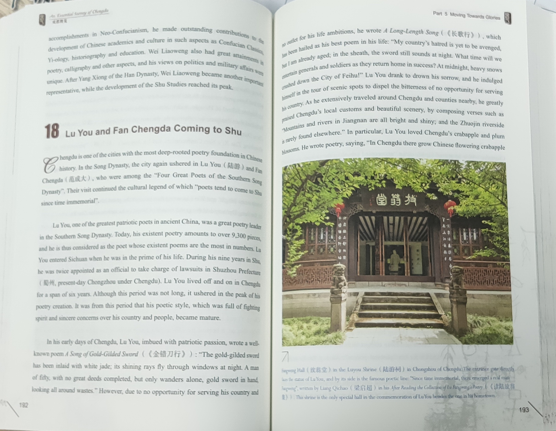 近日,在成都市地方编纂委员会办公室组织下,我校伟德国际1949教师陈达、杨存友、李学芹、龚小萍、郭志军组成的翻译团队,历时四年多、精心完成的鸿篇大作《成都精览》(英文版)由旅游教育出版社正式出版发行。