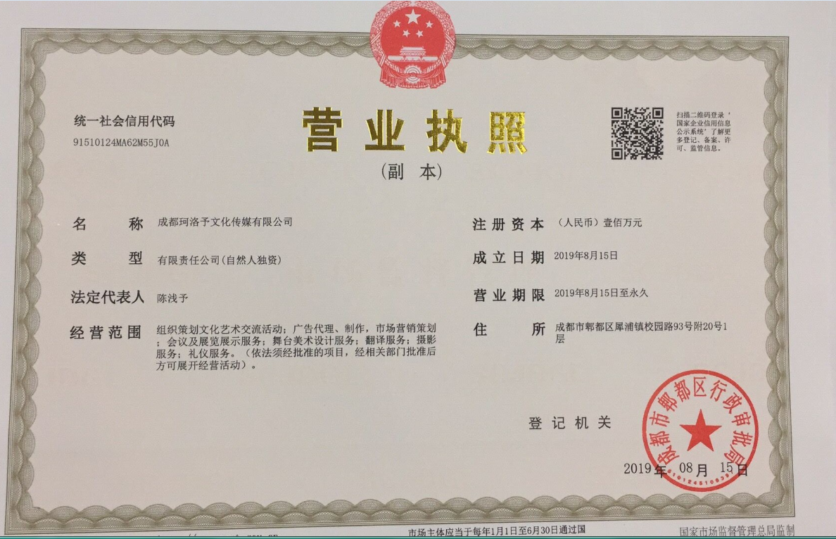 其中,我院2016级英语专业1班学生陈浅予同学在今年成功创办成都珂洛予文化传媒有限公司,并获得营业执照。