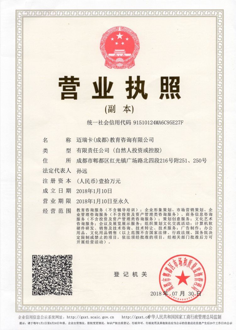 我院2015级英语专业专升本1班学生孙远在今年成功创办迈瑞卡(成都)教育咨询有限公司,并获得营业执照。此外,孙远同学还成功结题了国家级/省级大学生创新创业实践项目一项。