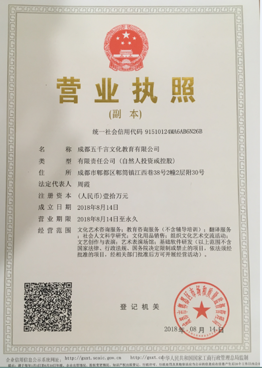 我院2019届应届毕业生,英语专业周霞同学成功创办了五千言文化教育有限公司,并获得营业执照。