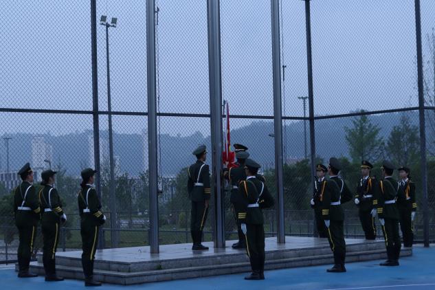 七点整,升旗仪式正式开始。国防特勤中队的同学们迈着整齐划一、铿锵有力的步伐,护送着五星红旗正步走向旗杆。国歌响起,全体师生昂首肃立,注视着五星红旗冉冉升起、迎风飘扬。此刻,他们内心汹涌着对祖国的热爱和敬仰,对美好未来的无限憧憬。