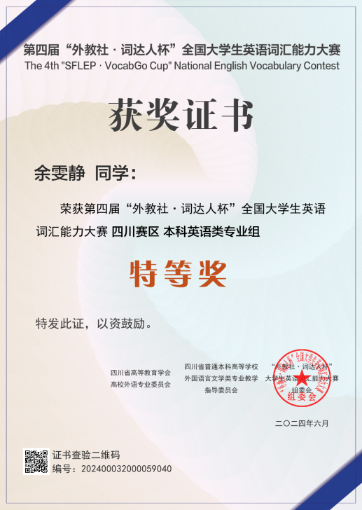 1 | 余雯静 | 2021 | 英语 | 特等奖 | 本科英语类专业组 |