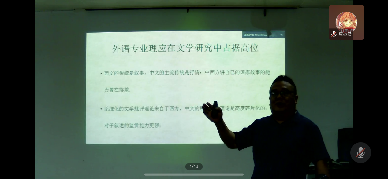 陈老师先以文化素养对于所有文科专业都很重要展开,也提到了外语学科的短板,具体表现在本硕阶段过于关注语言本体,缺少对于文学性的关注,也缺乏对于社会文化的深度观察和思考,同时也缺乏跨越多个学科的能力和视野。