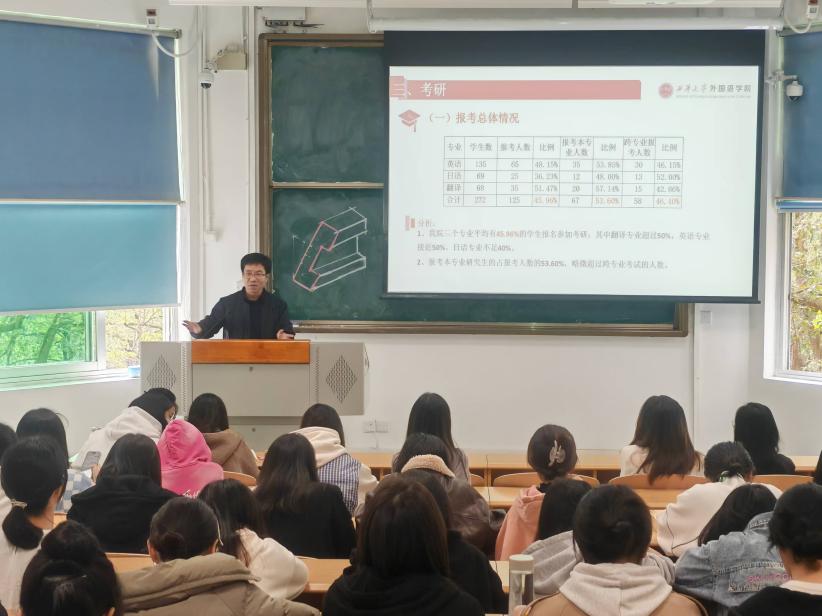 2024年10月23日,伟德国际1949,伟德国际1949始于英国在郫都校区成功举办了一场针对2025届本科生的“考研及就业指导与交流会”。本次交流会参会人员包括学院领导、教师以及英语、日语专业全体本科生。