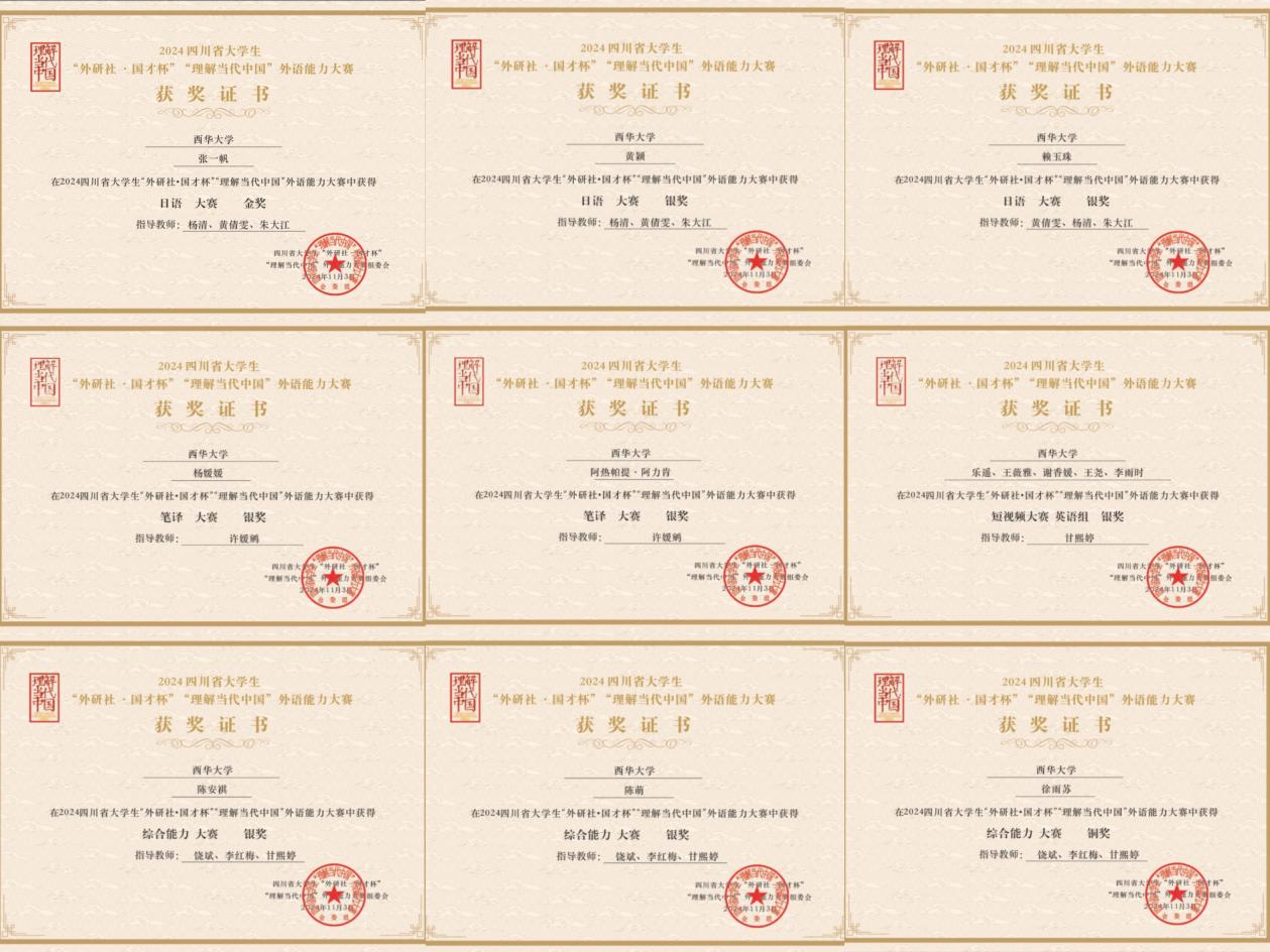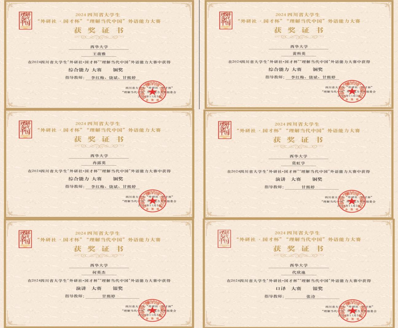 此外,代欣池、乐遥、王尧、谢香媛、王薇雅、李雨时等同学凭借优异表现,成功晋级2024年“外研社·国才杯”“理解当代中国”全国大学生外语能力大赛总决赛,代表我校和四川省继续在全国舞台上展现风采。