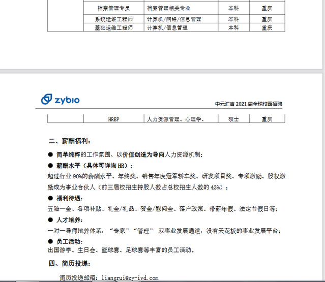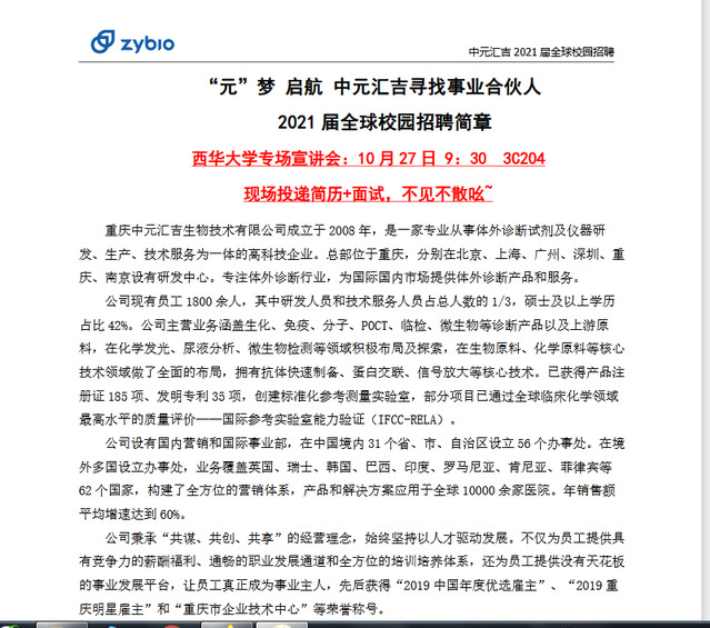 重庆中元汇吉生物技术有限公司2021届招聘简章