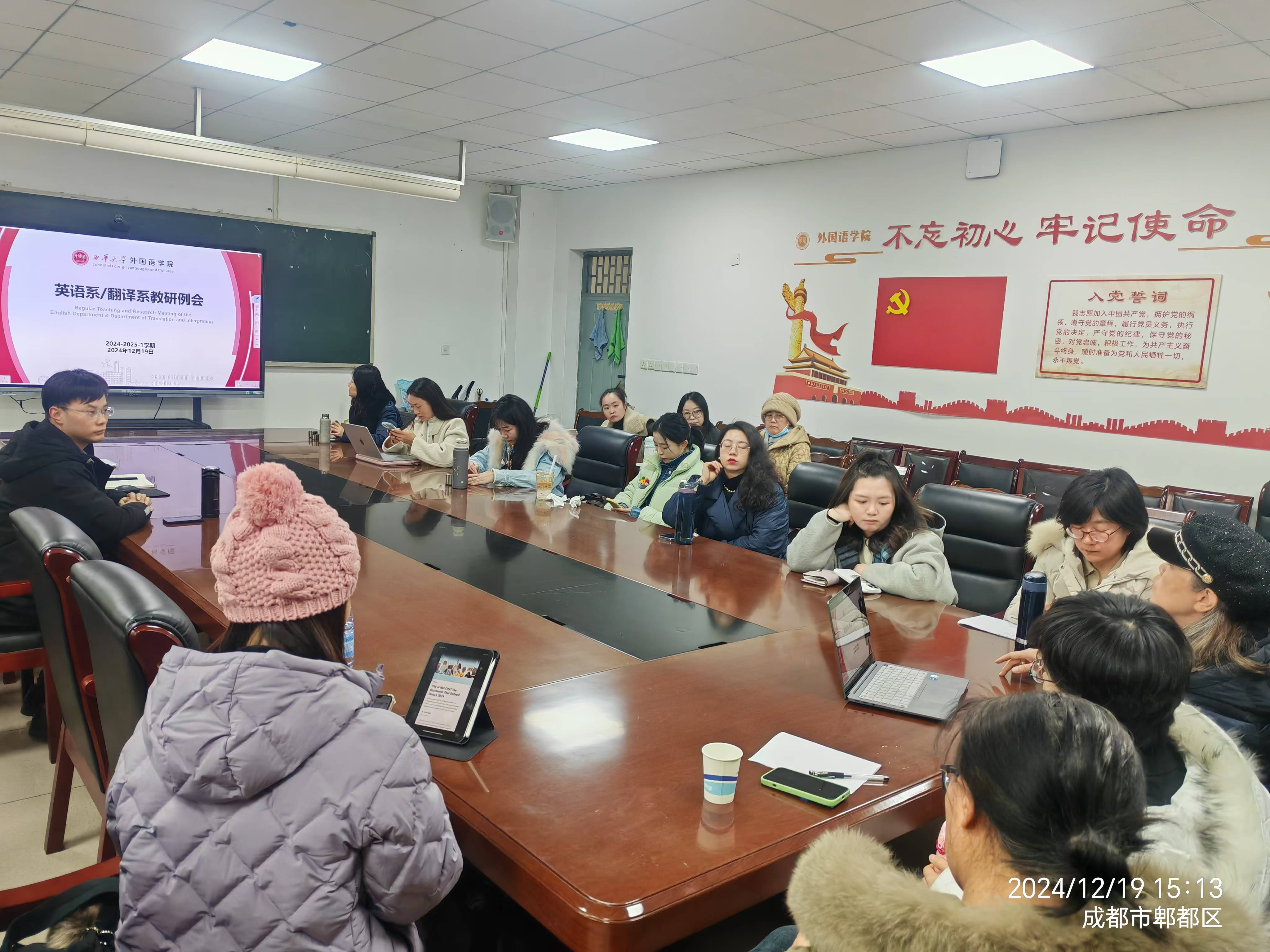 2024年12月19日,英语系与翻译系在郫都校区伟德国际1949317会议室联合召开了本学期期末教学研讨会。宜宾校区的教师通过线上方式同步参加了此次会议。本次研讨会旨在总结本学期教学与科研成果,探讨专业发展及招生工作,并为下学期的工作进行部署。会议特别邀请了副院长李学芹莅临指导,由英语系主任梁勇和翻译系主任李华英共同主持。全体系部教师积极参加了此次会议,共同为英语系和翻译系的未来发展献计献策。