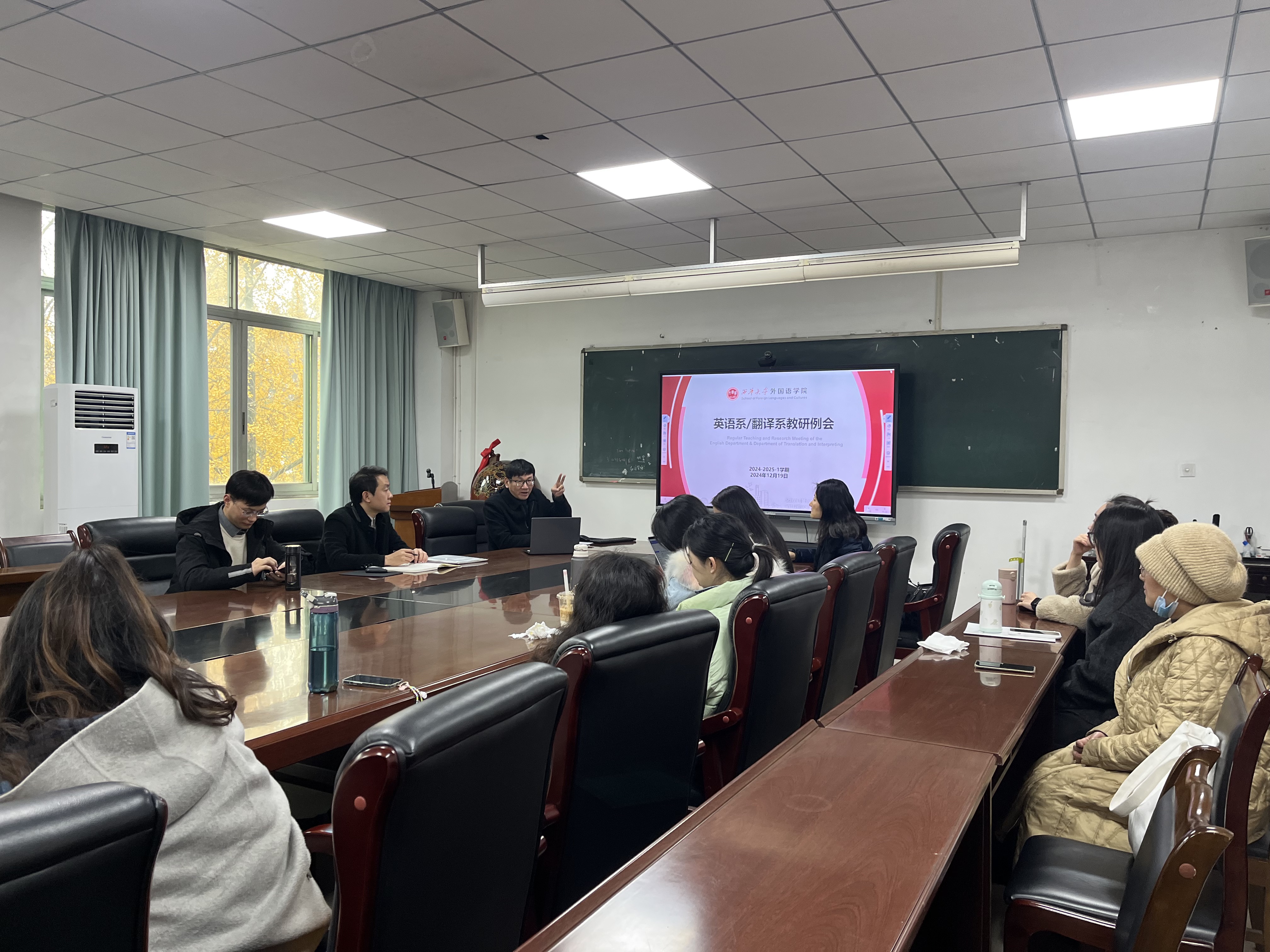 会议内容主要围绕以下三个方面展开:(1)期末教学与科研总结及年度考核事宜。英语系主任梁勇首先对本学期的教学工作进行了全面总结,对教师们在教学过程中的辛勤付出表示感谢。翻译系主任李华英则对翻译系的科研成果进行了梳理,并对年度考核工作提出了具体要求。与会教师纷纷发言,分享了自己的教学经验和科研心得。本次会议对新加入专业系部的教师尹伊珺博士进行了介绍,尹老师的到来受到了老师们的热烈欢迎。