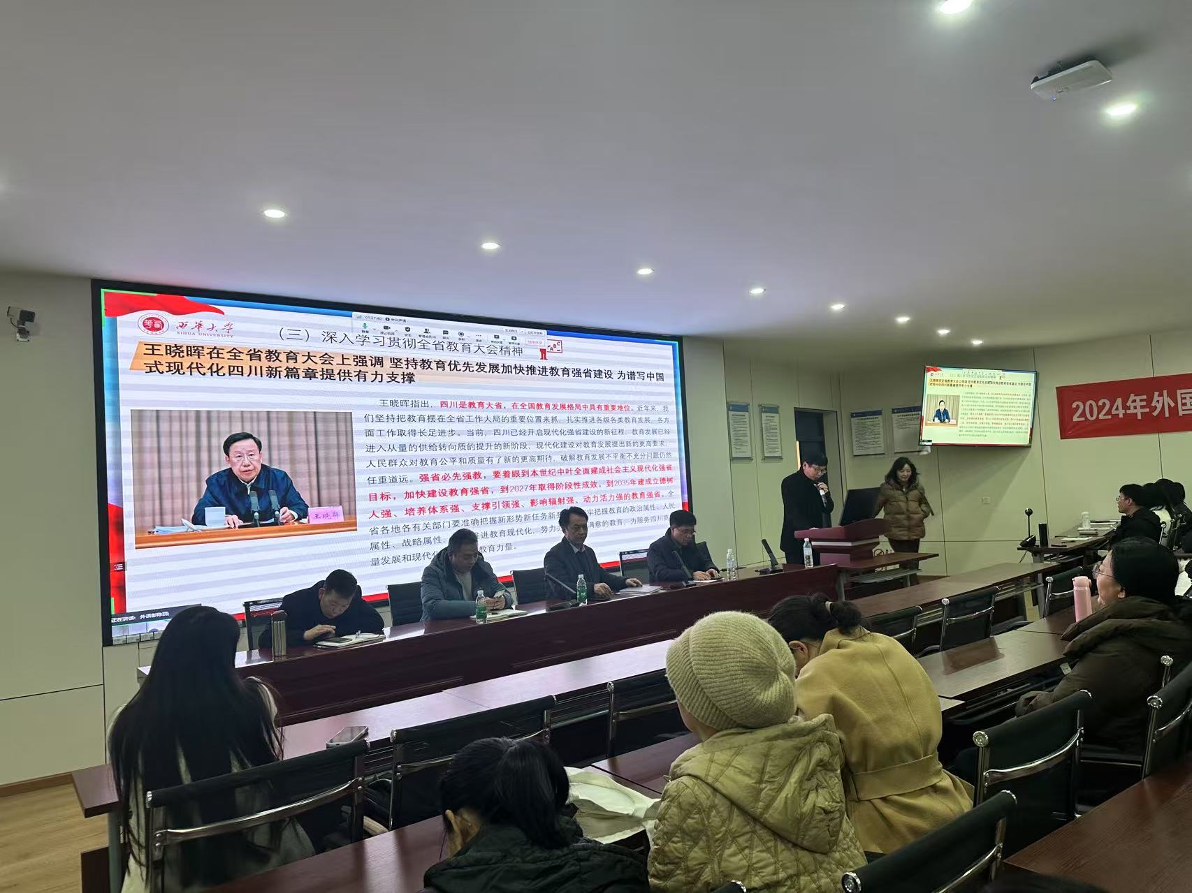 2024年12月19日下午,伟德国际1949全院大会在郫都校区4C504会议室和宜宾校区会议室同步举行。本次大会由学院党委书记唐润华主持,全体教职工参加,旨在开展本年度领导干部述职测评考核工作。