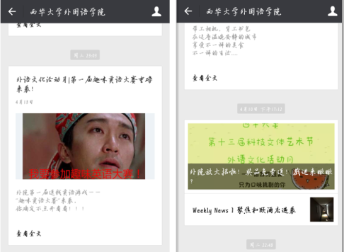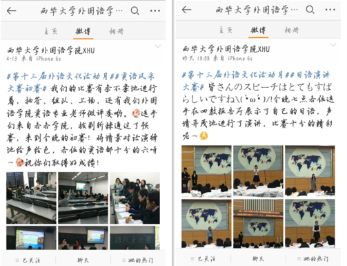 由我院主办的西华大学第十三届科技文化艺术节之外语文化活动月系列活动于4月正式拉开序幕,宣传报名工作正在如火如荼的进行。外语文化活动月以营造外语学习氛围,提高全校学生外语学习积极性和整体学习水平,提升全院学生的专业学习能力及综合素质为宗旨,以展示我校学生风采,丰富校园文化生活为目的。