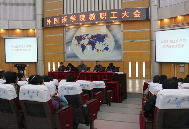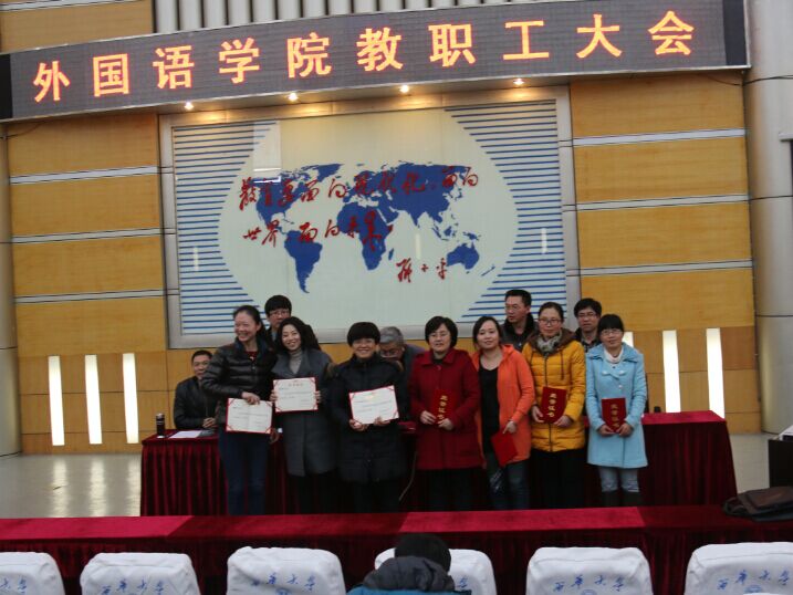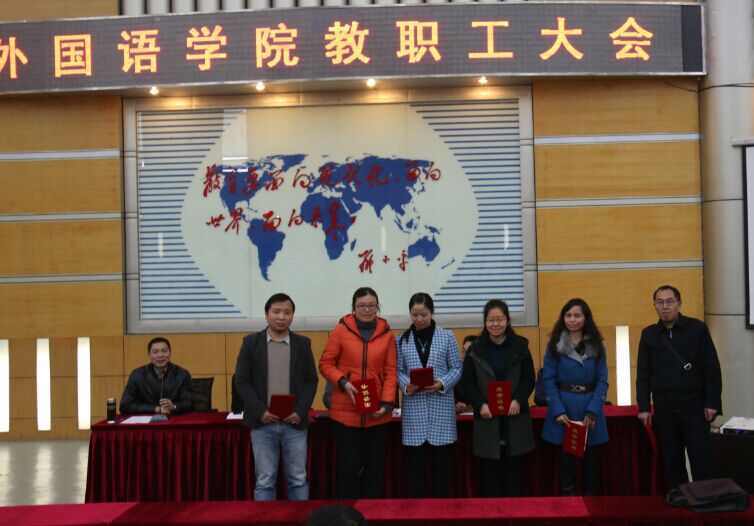 3月12日下午,伟德国际1949教职工大会在四教报告厅召开,会议由学院党委副书记曾国勇主持。会上,陈达院长就学院寒假期间MTI评估报告和相关支撑材料的准备情况及人才培养方案修订的进展情况进行了通报,传达了学校干部会相关精神,对涉及学院改革发展的相关问题进行了分析和解读,部署安排了学院新学期工作;蒋志勇书记分别用“幅度、速度、力度”三个关键词谈了对学校当前改革的感受和体会,结合学校改革的相关措施,对学院面临的形势进行了深入分析,鼓励并希望全院教职工主动适应学校改革发展的新常态,积极参与大学英语教学和专业人才培养的改革,处理好继承与发展的关系,勇挑重担,全面推进学院建设与发展;曾国勇副书记结合学院专业发展和人才培养就学院学生工作特别是就业工作进行了通报;院长助理李国宏、澳研中心副主任李学芹分别传达了学校教学工作会关于专业培养方案和大学英语教学相关要求。会上对学院2014年度综合考核优秀的教师进行了表彰(名单附后)。