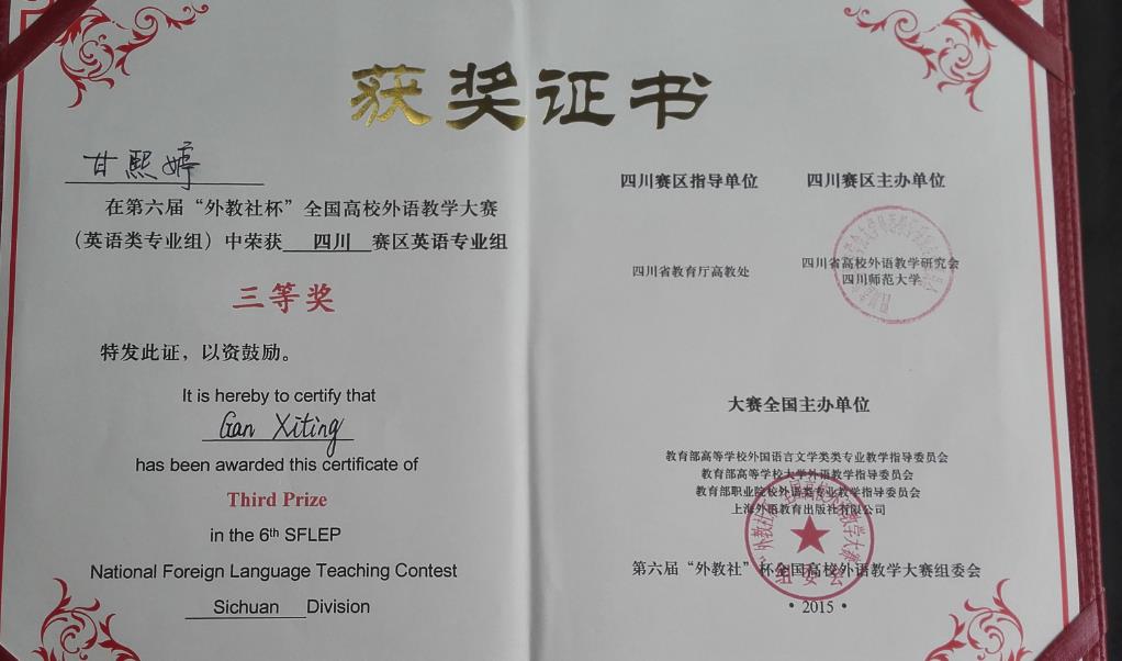 6月6日至7日,由教育部高等学校外国语言文学类专业教学指导委员会、教育部高等学校大学外语教学指导委员会、教育部职业院校外语类专业教学指导委员会、四川省高校外语教学研究会、四川师范大学、上海外语教育出版社联合主办,四川教育厅高教处指导的第六届“外教社杯”全国高校外语教学大赛(英语类专业组)在四川师范大学(狮子山校区)举行。经过复赛、决赛一天半时间的激烈角逐,我校伟德国际1949英语系青年教师甘熙婷代表西华大学参加比赛,并凭借出色的综合技能和临场应变能力荣获四川赛区比赛三等奖。