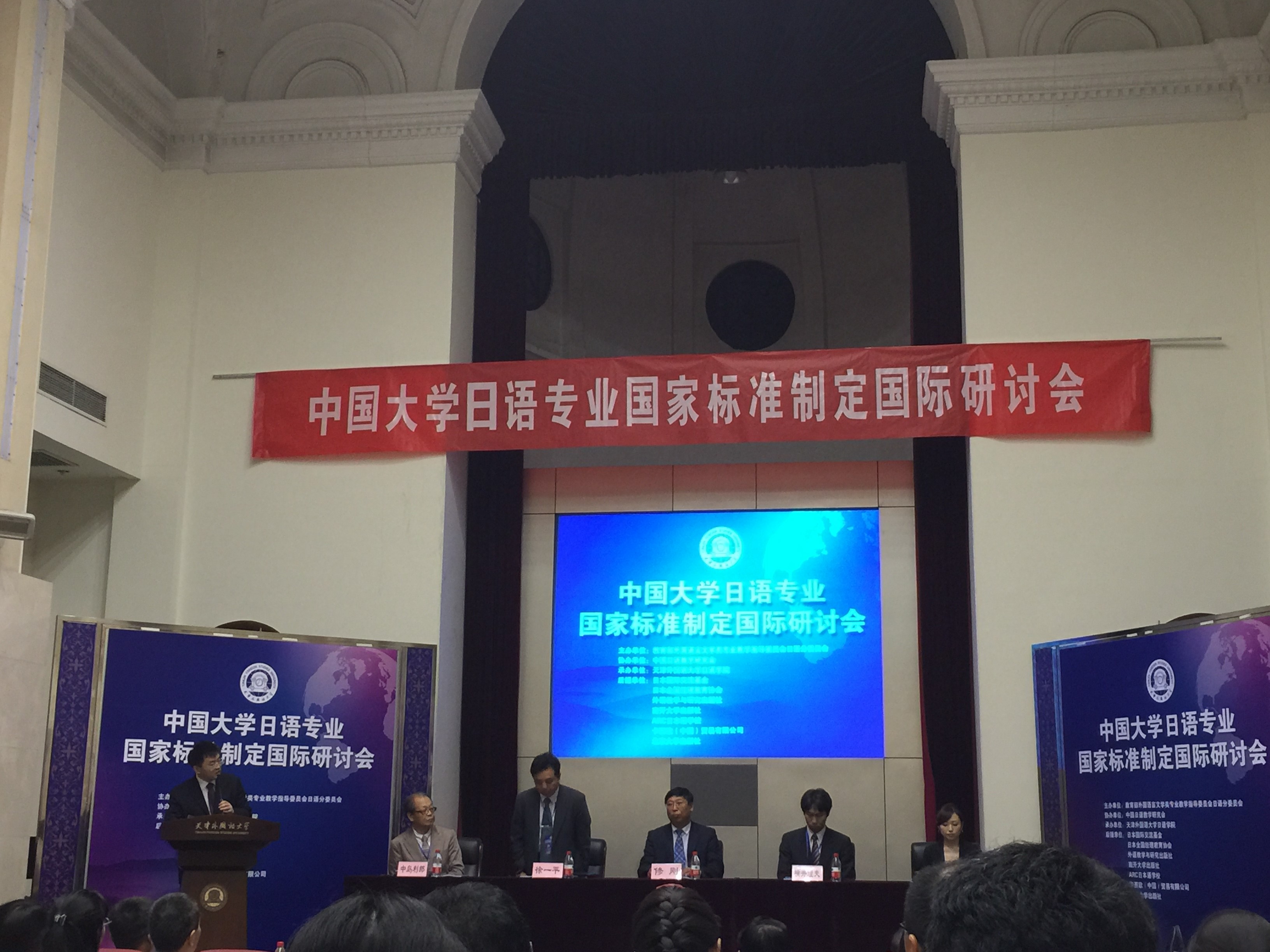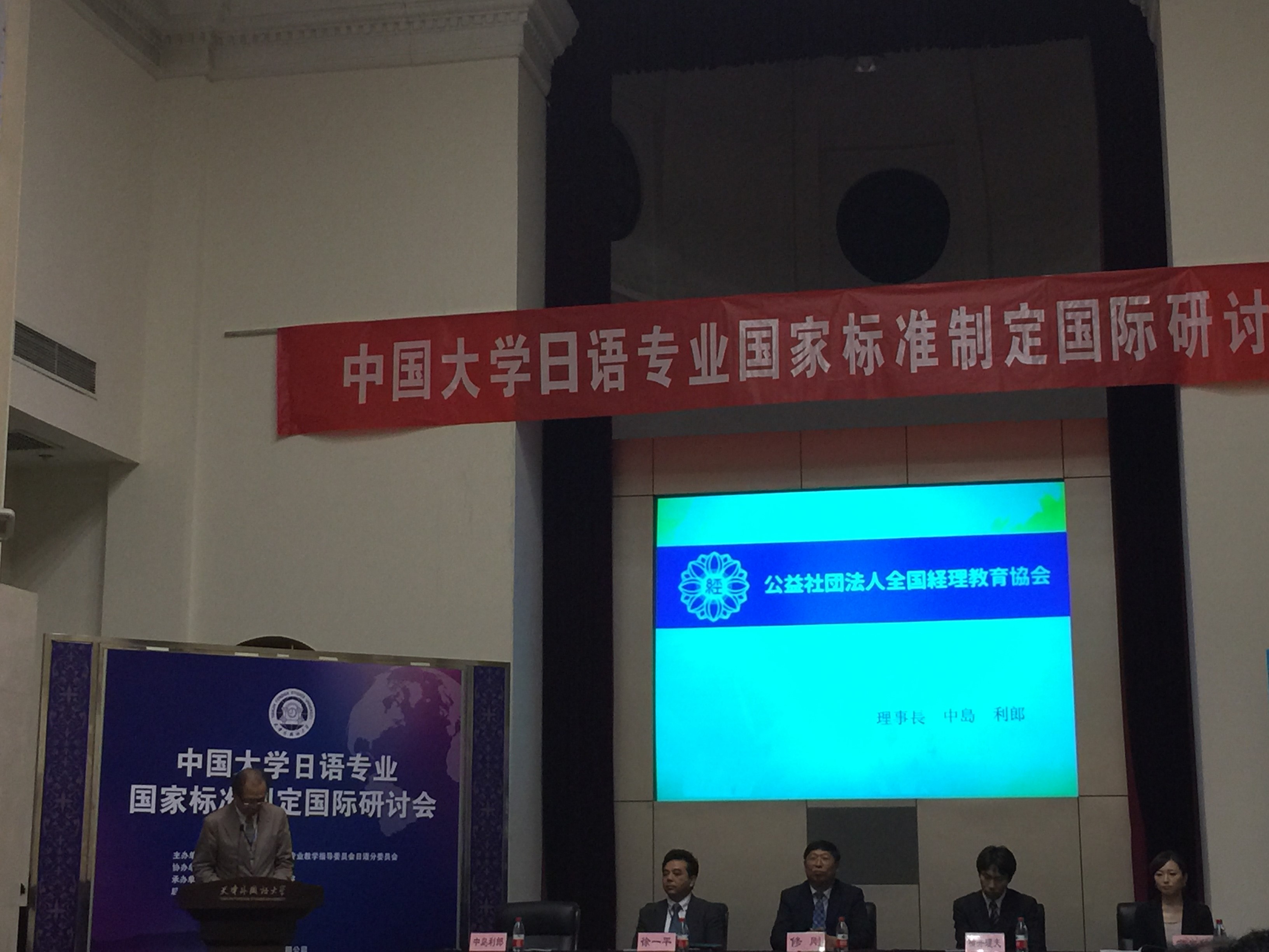 天津外国语大学日语学院院长朱鹏霄教授主持的开幕式。天津外国语大学校长修刚教授、日本驻华大使馆参赞横井理夫、日本国际交流基金北京日本文化中心主任助理守屋谅、公益社团法人全国经理教育协会理事长中岛利郎出席开幕式并致辞。来自北京大学、清华大学、北京外国语大学、上海外国语大学、天津外国语大学、四川外国语大学等外指委日语分会的委员以及国内外日语专家、学者约240人出席了此次会议,就日语专业国家标准的相关问题和日语专业教学法等开展了深入的探讨和广泛的交流。我院也派日语系系主任尹建英、党支部书记杨清出席了本次会议,并跟出席会议的学者进行了良好深入的交流。