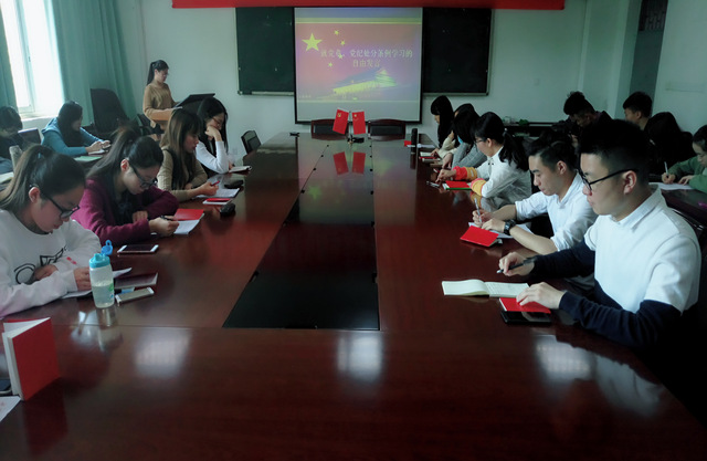 本次组织生活以“学习党章、党纪处分条例,争做合格党员”为主题。会上,各党员同志首先回答了有关党章和党纪处分条例的相关考题,随后,大家就学习党章和新版的党纪处分条例谈了自己的学习心得。各党员同志结合现在社会的热点问题以及热播剧选取合适的角度分析党员的责任和义务,并认识到作为一名合格的党员必须要对党章和党纪有坚定的信仰,才能严守党的纪律,充分发挥先锋模范作用。最后,王慧老师强调了党员的责任和义务,鼓励各党员同志坚定积极参加实践活动,在实践中不断进步。