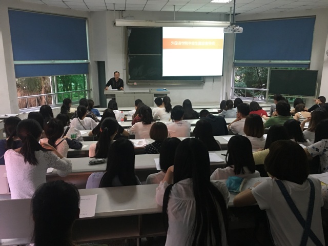 罗海副书记首先就2013级毕业生现在的就业情况进行了分析总结,并针对当前的就业形势,结合外语类用人单位对人才的需求,对还未就业的毕业生做出相应要求。罗海要求每一个未就业的同学根据自身情况进行全面剖析,找准定位,调整好心态,积极关注就业形势,关注学校就业网站、就业微信的招聘信息,踊跃参加招聘活动,把握就业机会。最后,罗海就办理户口迁移,党、团组织关系接转等注意事项进行了详细说明。