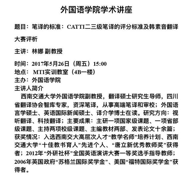 CATTI二三级笔译的评分标准及韩素音翻译讲座(5月26日,主讲人:林娜副教授)