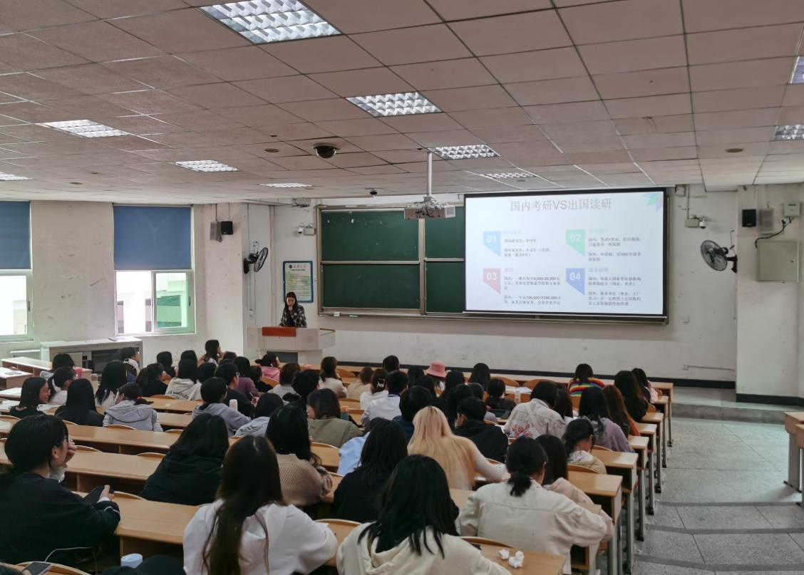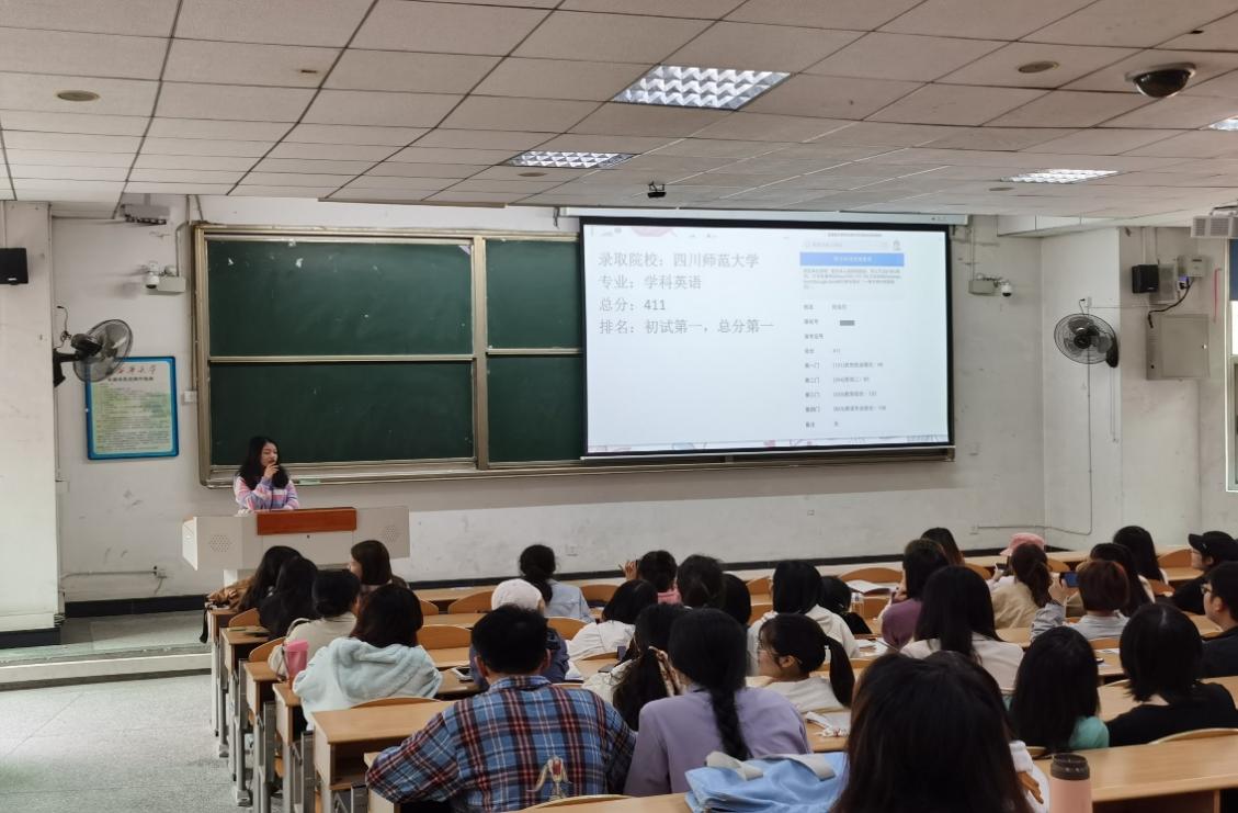随后,2017级学姐们进行了关于考研、出国经验分享。学长学姐们都结合自身考研经历,进行了全方位的考研分享。无论是跨专业考西安外国语大学教育学硕士的袁利军同学,本专业考学科英语硕士的陈佳纹同学,亦或成功申请到南安普顿大学的唐荣枝同学,都根据自身考研经历,分享自己收获成功的小秘诀以及诸多注意事项。在同学们的热情探索下,学姐们也亲切的解答了同学们关于备考情况、压力缓解、院校选择等问题,帮助同学们加深考研的认知与了解。