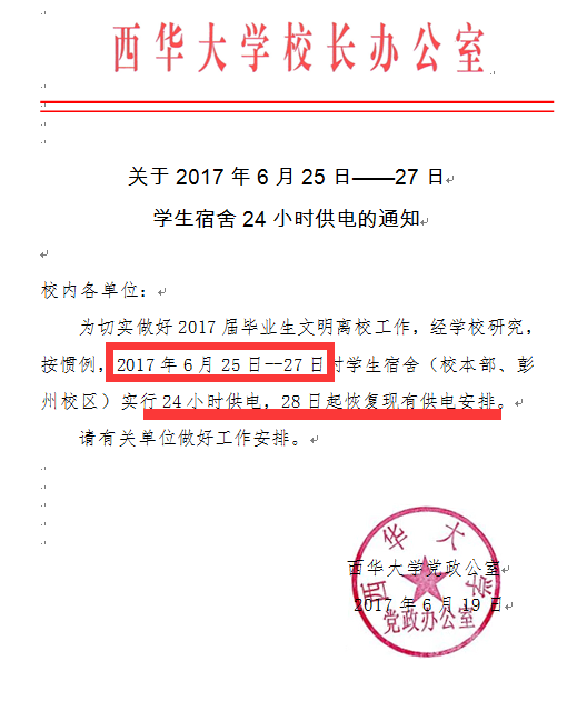 6月25-27日学生宿舍24小时供电的通知