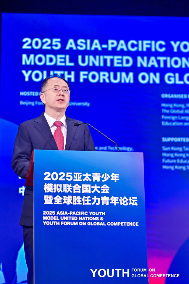 开幕式上,北京外国语大学校长、党委副书记贾文键在欢迎辞中强调,希望与会青年厚植家国天下情怀,秉持和而不同理念,勇担时代责任,拓展国际视野,积极投身人类进步事业,为世界和平发展与文明进步贡献青春力量。香港理工大学副校长(研究及创新)赵汝恒在致辞中表示,香港理工大学致力于培育心系家国、肩承世界的领袖人才,这与模拟联合国的精神紧密相连。他鼓励青少年代表在活动中秉持“科技向善” 的创新思维,淬炼全球胜任力,实现 “不让任何人掉队” 的可持续未来。