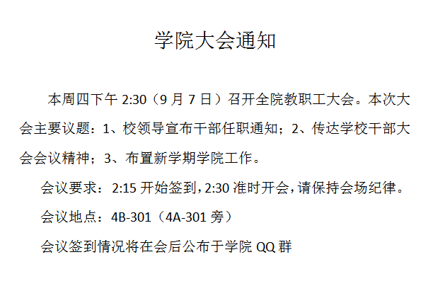 学院教职工大会通知(时间:9月7日14:30;地点:4B301)