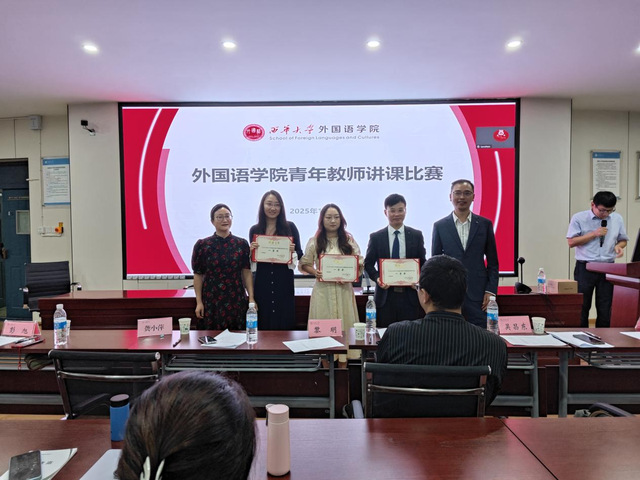 经评审专家团严格评审,最终评选出特等奖2名、一等奖3名、二等奖5名。其中,梁勇、张诗两位教师凭借清晰的教学逻辑、生动的课堂互动及优异的教学呈现斩获特等奖;于云飞、石兴、杨婷三位教师荣获一等奖;袁乙榛、尹伊珺、谭震、关宁、黄倩雯五位教师获得二等奖。西南交通大学伟德国际1949副院长黎明教授等评审嘉宾为获奖教师颁发荣誉证书,并与全体参赛教师、工作人员合影留念。