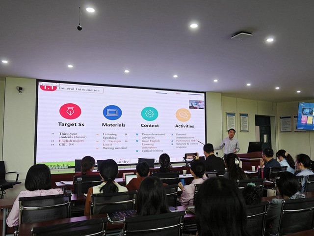 随后,16名参赛教师按照赛前抽签确定的顺序依次登台进行教学展示。展示过程中,各位教师精神饱满、教态端庄自然,紧密围绕外语教学重点章节与文化主题,灵活运用多媒体课件、情景模拟教学、小组合作讨论等多样化教学手段,将语言知识传授与能力培养有机结合。各位教师凭借扎实的教学功底、鲜明的教学风格与精心的教学设计,呈现了一堂堂高质量的外语教学课。