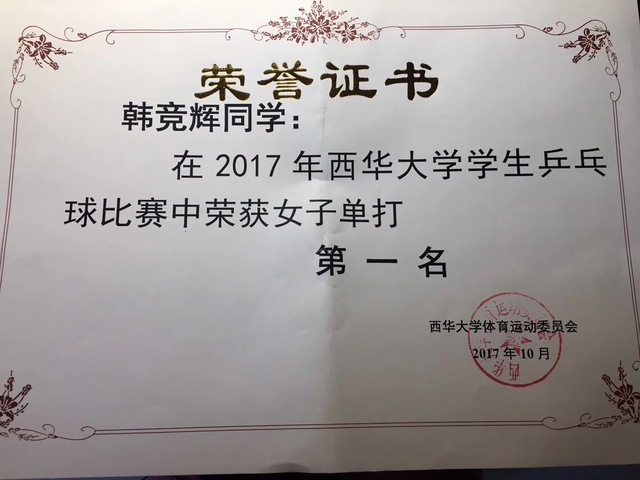 10月23日至11月3日,由西华大学体育运动委员会组织与策划的西华杯乒乓球比赛在我校高水平训练中心成功举办。我院研究生韩竞辉同学在单打比赛中表现突出,一路过五关斩六将,最终获得女子单打冠军。