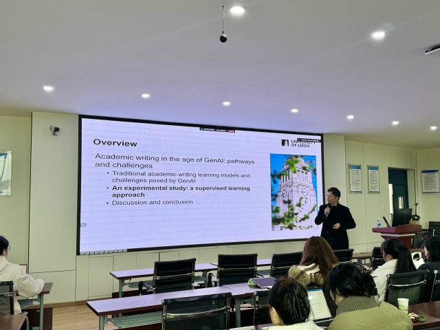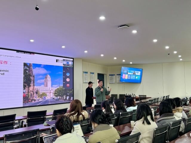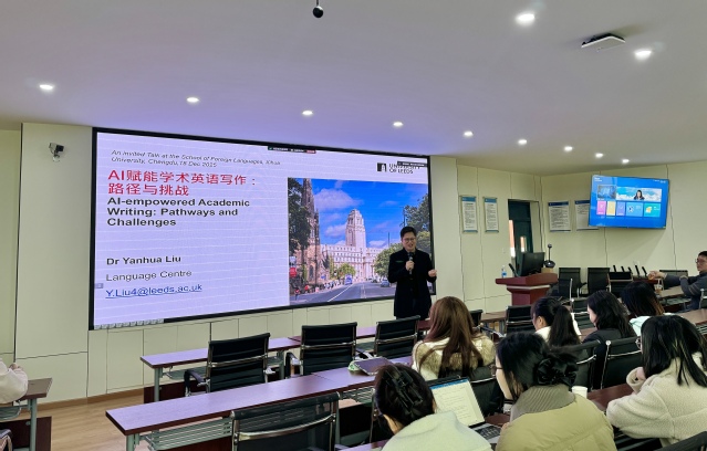为探讨人工智能时代学术英语写作教学的新范式,提升师生数字素养与教学创新能力,2025年12月18日下午,伟德国际1949在4C-504教室成功举办题为“AI赋能学术英语写作:路径与挑战”的学术讲座。本次讲座特邀英国利兹大学语言中心学术英语讲师、博士生导师刘焰华博士担任主讲,讲座由西华大学伟德国际1949教师张玄主持,吸引了西华大学伟德国际1949部分教师、研究生以及西南交通大学伟德国际1949部分教师到场聆听。