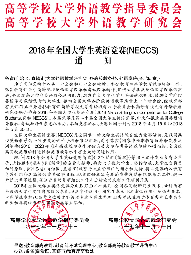 2018年全国大学生英语竞赛(NECCS)报名工作已启动。NECCS是经教育部有关部门批准举办的全国唯一的大学英语综合能力竞赛活动,本届竞赛是第二十届全国大学生英语竞赛。相关情况如下: