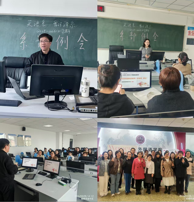 全体教师集中学习2026年“两会”重要精神,结合外语教育与翻译专业建设展开热烈研讨,切实把会议精神转化为推动教学改革、服务育人工作的实际行动。会议系统部署本学期重点工作,围绕智慧教学模式更新、学科竞赛组织、本科毕业论文指导、人才培养方案优化等关键任务进行充分讨论,明确工作目标、细化责任分工,为新学期各项工作高效有序开展奠定坚实基础。