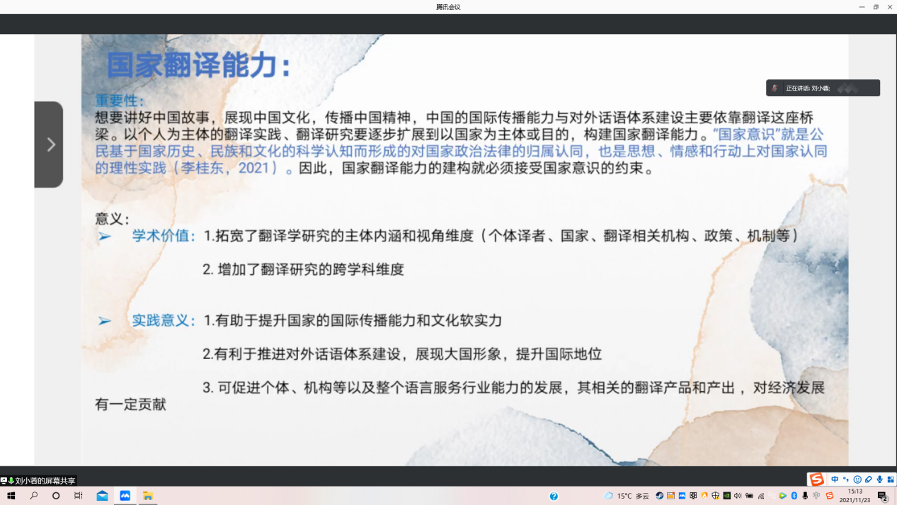 接着,她通过“什么是国家翻译能力?”的问题以及介绍时代背景,让与会的同学们深刻了解到国家翻译能力的重要性、学术价值及其重大学术意义。最后,她指出本科生与研究生应该具备的翻译能力是不断进阶的。本科生应具备的翻译能力:母语修养、外语技能、翻译技巧。而研究生应该具备的翻译能力可分为翻译能力、译者素养。对于翻译能力的培养和提高切记不可操之过急,它是一个日积月累、长期实践的过程。