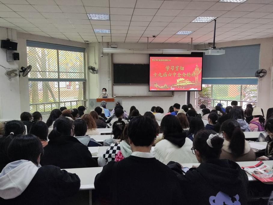 11月30日13时,为进一步学习习近平新时代中国特色社会主义思想,贯彻十九届六中全会精神,伟德国际1949在4A—101开展了以“学习贯彻十九届六中全会精神”为主题的学习会。本次学习会由伟德国际1949团委指导老师彭陈丽主讲,学院团委学生会全体成员参加。