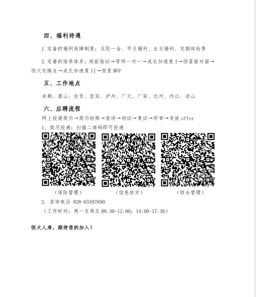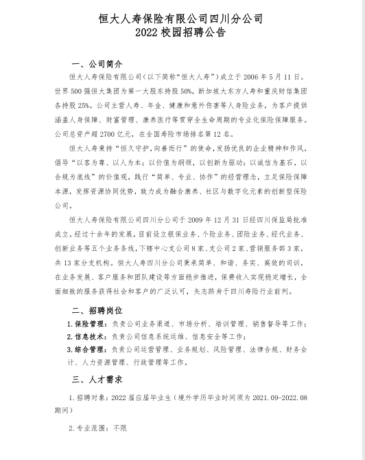 恒大人寿保险四川分公司招聘