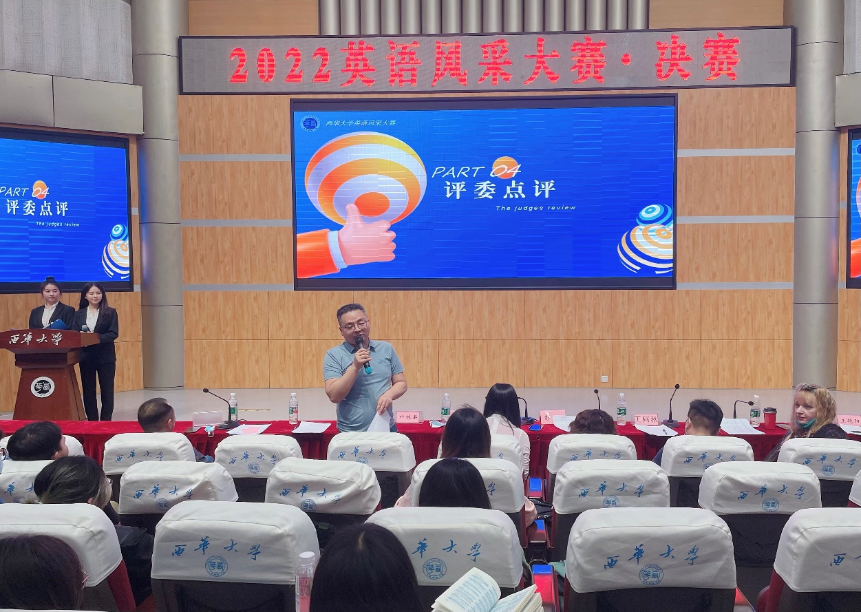 选手的精彩演讲结束后,由叶林果副院长、王阿秋老师、许媛鵷老师和彭旭老师对比赛进行点评。叶林果副院长对本次大赛主题作出了评价,提出英语学科的魅力更有待同学们去发现,“寓学于练”是很好的学习方法,希望此类大赛多多开展、每年开展;许媛鵷老师鼓励了各位参赛选手,并为同学们介绍了一些演讲技巧;彭旭老师对选手发言时的一些细节问题展开了说明;王阿秋老师则总结了本次大赛举办的全况,同时同现场即兴的表演激发同学们对于多维度学习英语的热情,评委老师们精炼的总结让每一位同学都受益匪浅。