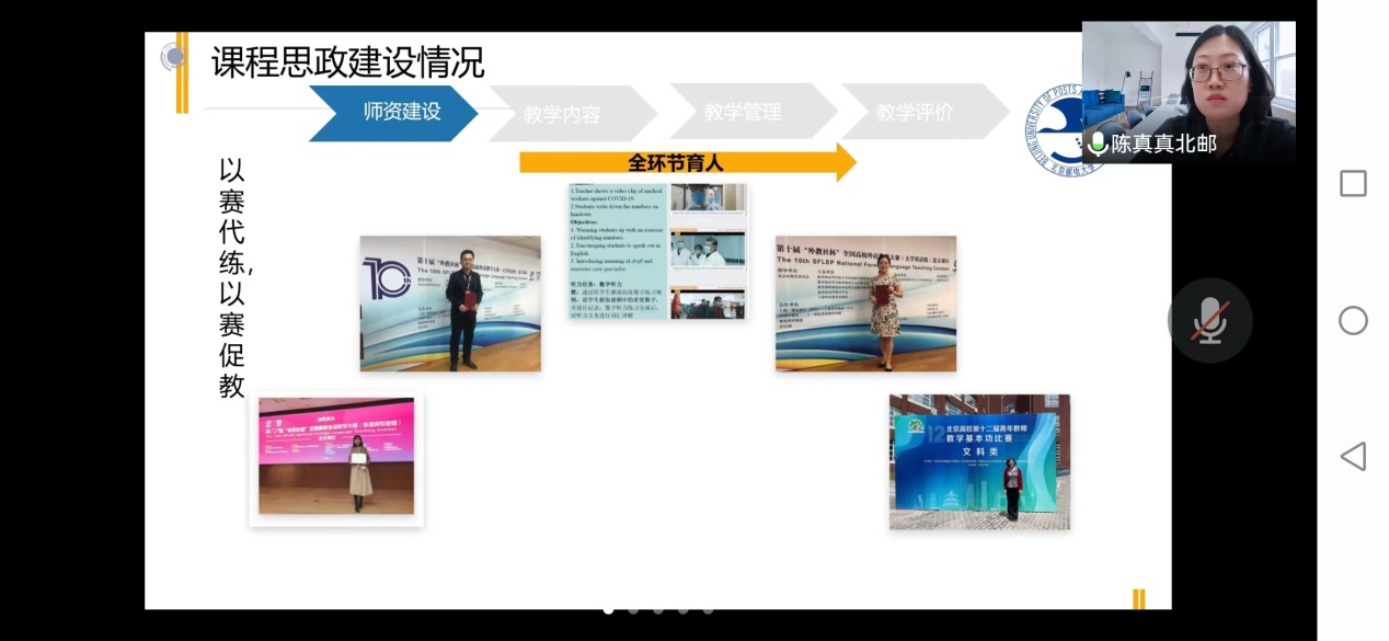 依托现代教育技术进行教学和改革,自主研发教材、教学平台和实验平台,在“全环节育人”理念下,促进了师资建设,课程内容的改革与建设,教学管理水平的提高和教学评价的多元化。北邮的《情景英语视听说》获首批国家一流本科课程,该课程经过20年积淀,多代教师传承,培养了一大批优秀教师,并通过“以赛代练,以赛促教”,参加各级各类教学比赛获奖;促进了科研和教学的发展,成功获批国家社科基金项目等各种高水平研究项目,发表高质量研究成果。组织“明日之星”校园风采大赛,将中国元素融合,鼓励学生讲好中国故事,促进学生全面发展。