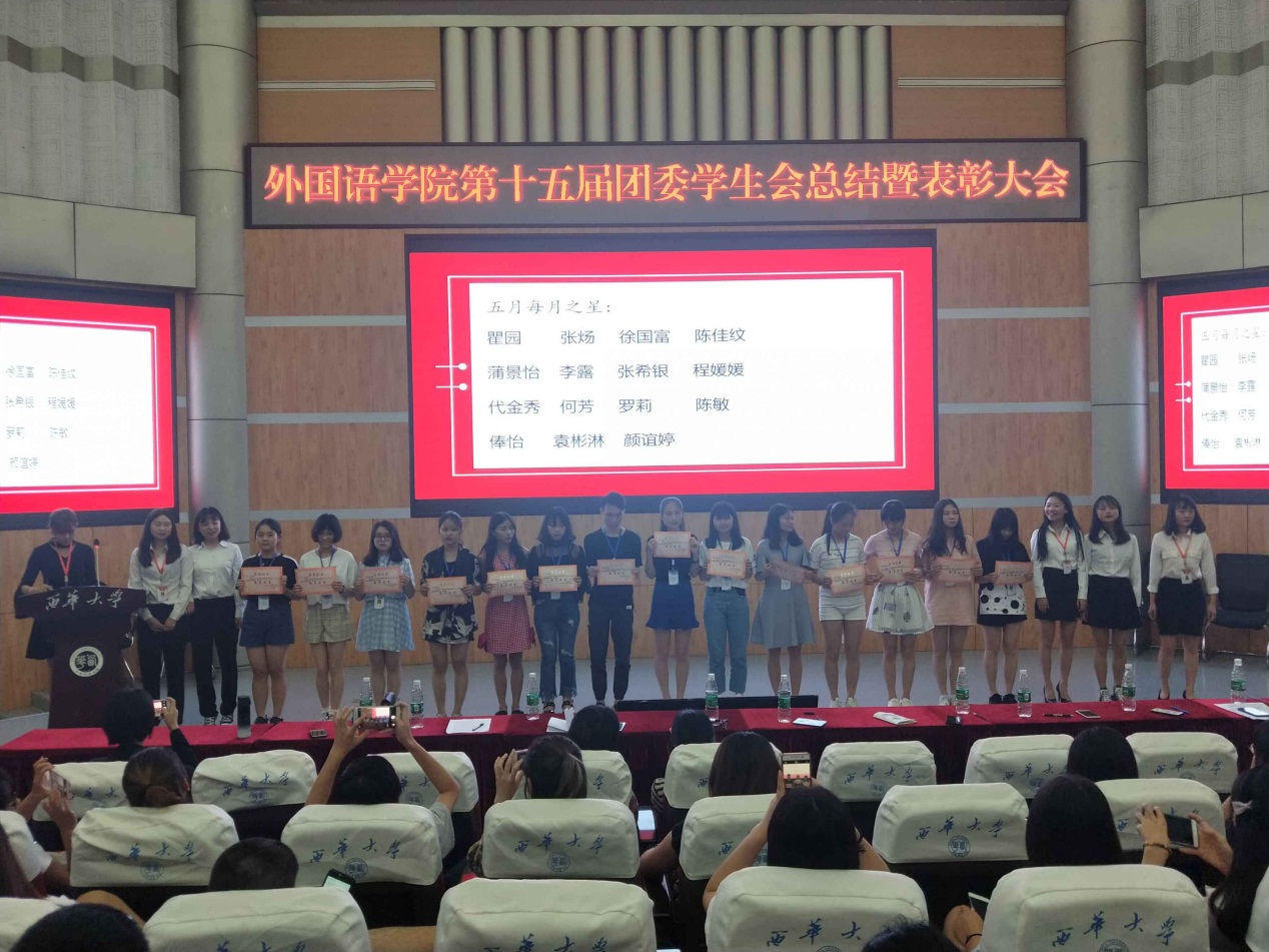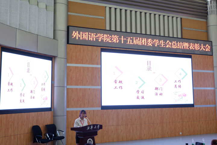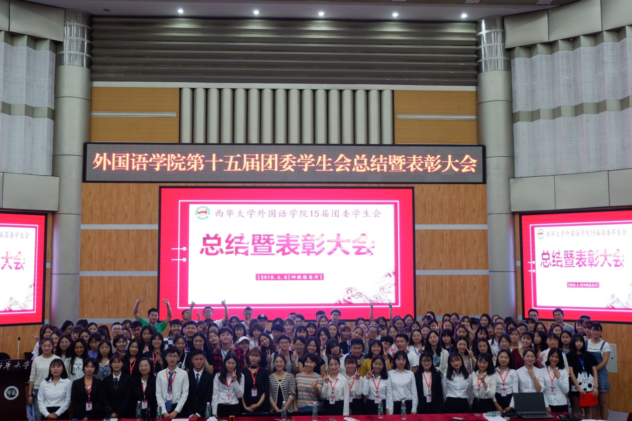 6月8日晚上7点,我院组织开展的第十五届团委学生会总结暨表彰大会在四教报告厅召开。此次大会主要由我院团委学生会组织开展,我院团委书记曾渝理和新媒体指导老师杨磊参加此次大会,学生会副主席陈显翠主持大会。