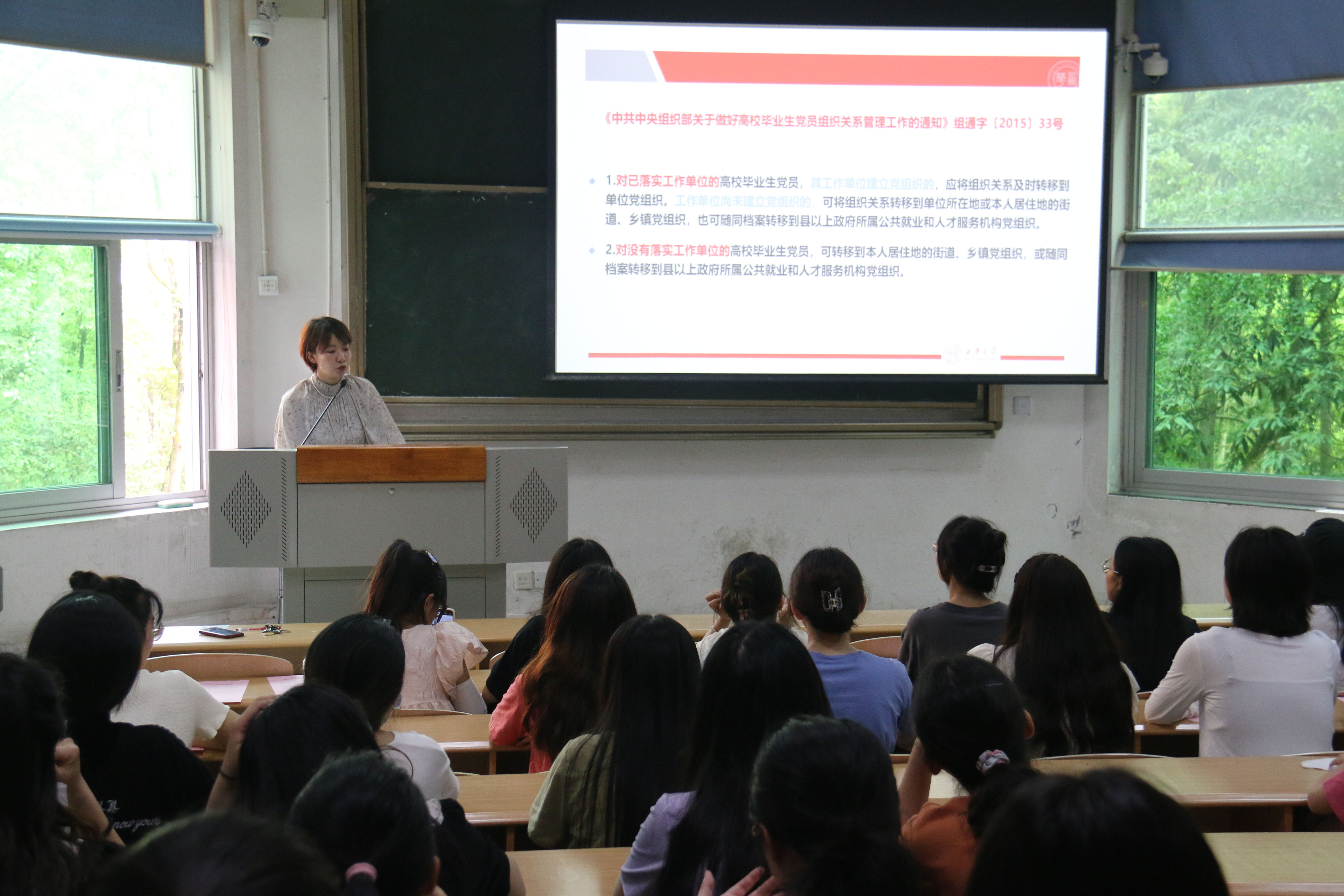 会议第一个议程是学院党委副书记罗海致辞。罗海副书记强调了毕业生文明离校工作的重要性,同时罗海副书记对全体毕业生党员提出了要求,希望同学们要规范履行党员权利和义务,时刻铭记党员身份,充分发挥毕业生党员的榜样示范引领作用。会议第二个议程是全体党员重温入党誓词,由2022届本科毕业生党员彭洁领誓。铿锵有力的誓言,激励着全体毕业生党员不忘初心、牢记使命。会议第三个议程是全体毕业生党员签署《西华大学毕业生党员承诺书》。会议第四个议程是曾渝理老师给毕业生党员讲解党组织关系转接注意事项。曾老师强调了党组织关系转接注意事项,对毕业生党组织关系转接进行了专题培训,并进行了详细的解答。