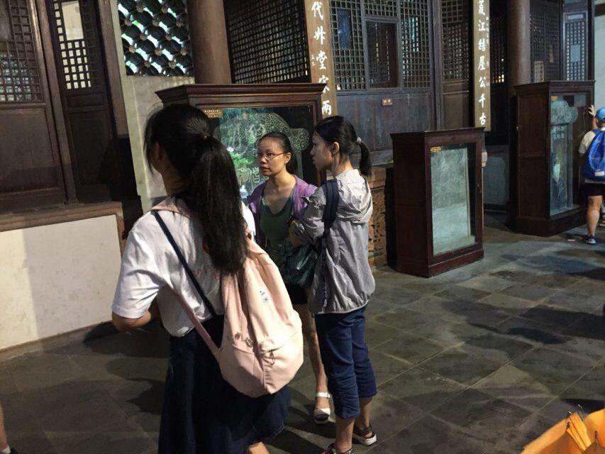 77日,外国语学2018暑期三下乡杜甫草堂小分队在进行了两天的解说学习后,于今日正式开展了定点解说的活动。到达草堂后,队列成员各自熟悉解说词,采用分组进行的方式,为来到草堂的游客进行解说。其中,队列7人分为三组,分别在大廨、工部祠和茅屋三个景点开展讲解工作。