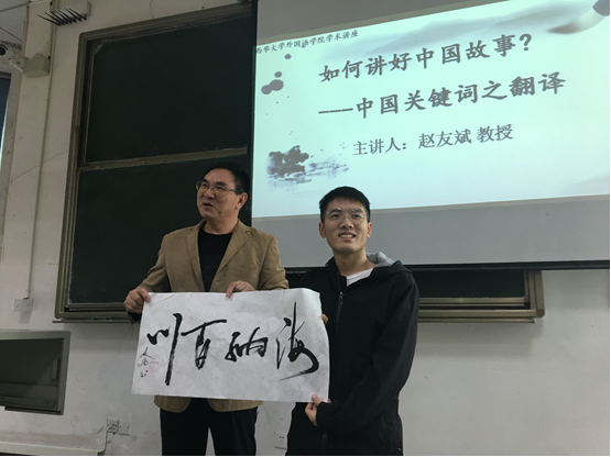 在讲座中,赵教授明确提出“什么是中国关键词”,并指出要想做好中国关键词的翻译,重要的是做到语言的规范和准确。同时要将翻译与实际结合,而不能以“中式”的语言思维方式想当然地翻译。如有人把“驴友”译作“donkey friend”,“凤凰男”译作“phoenix man”,甚而把“不折腾”译作“buzheteng”,这样似是而非的翻译,只有中国人能理解,外国人却不得其意,是不能“讲好”中国故事的。