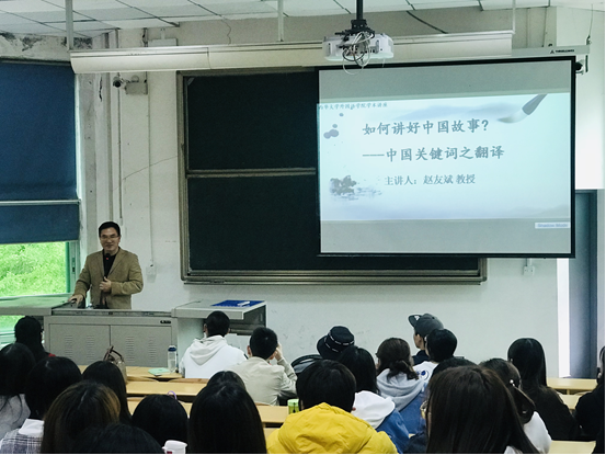 10月17日上午,暨南大学翻译学院院长赵友斌教授来到伟德国际1949,在4A401教室为同学们带来题为“如何讲好中国故事——中国关键词之翻译”的讲座。