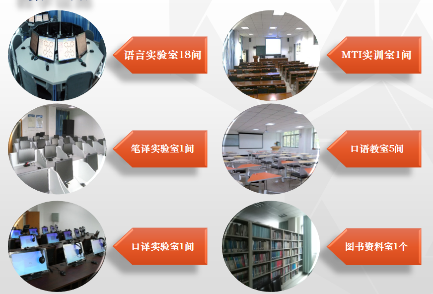 学院拥有18个多媒体语言实验室、1个笔译实验室、1个MTI实训室、1个口译实验室、5个口语多媒体教室、1个计算机房、1个图书资料室,能够满足教师教学、科研与学生学习的需要。