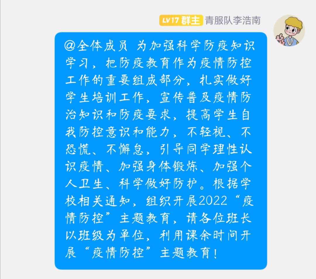 2022年10月22日,西华大学外国语各年级辅导员下发通知,组织各年级学生开展2022“疫情防控”主题教育。并由伟德国际1949团委学生会青年志愿者服务队负责跟进开展进度。在伟德国际1949班长对接群与各班班长进行对接,确保疫情防控主题教育有效进行。