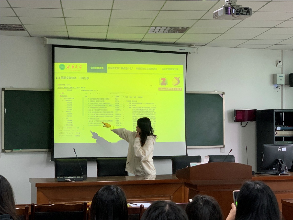 2020级翻译专业的马璨同学,从论文前期准备、如何看文献与写论文的心得等方面分享了自己的经验。首先大量阅读相关文献,并使用citespace或zotero分类,对于研究对象案例整理,可以从分析中寻找论文写点;其次确认论文采取什么研究方法;最后动笔并不断完善论文。